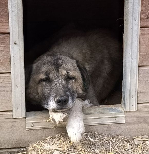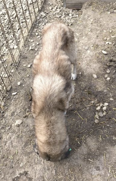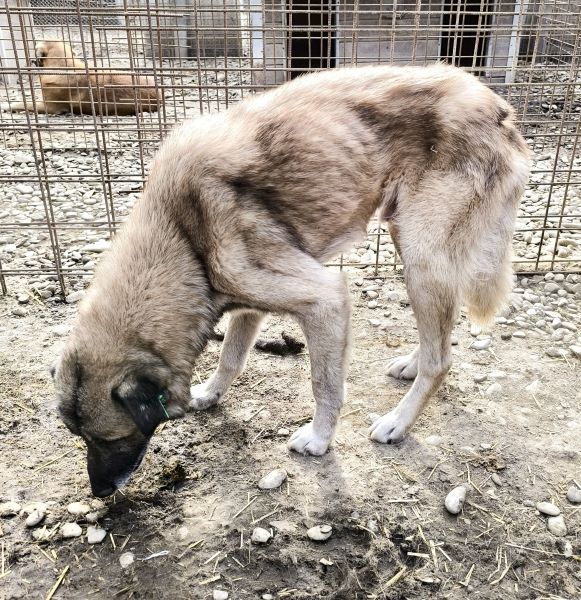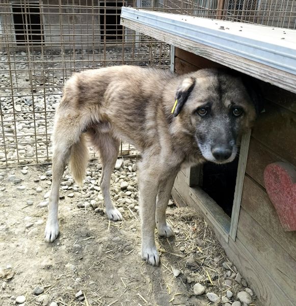 CARLSON war zunächst nur in der Hütte, ließ sich dann durch Leckerli dazu bewegen, heraus zu kommen. Da haben wir dann auch bemerkt, dass er viel zu dünn ist. Sein Hunger veranlasste ihn dazu, uns ganz nah zu kommen und die Leckerli vom Boden zu nehmen. Er ist noch recht neu im Shelter und von der Situation noch überfordert. Außerdem befindet sich im Kennel ein weiterer Hund, der das Futter gegen die anderen Hunde im Kennel verteidigt.