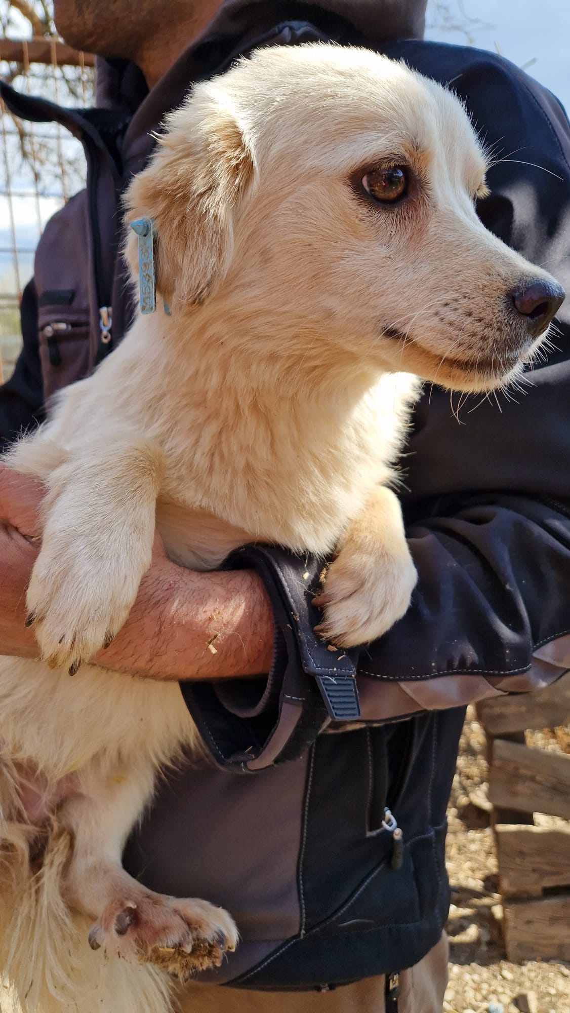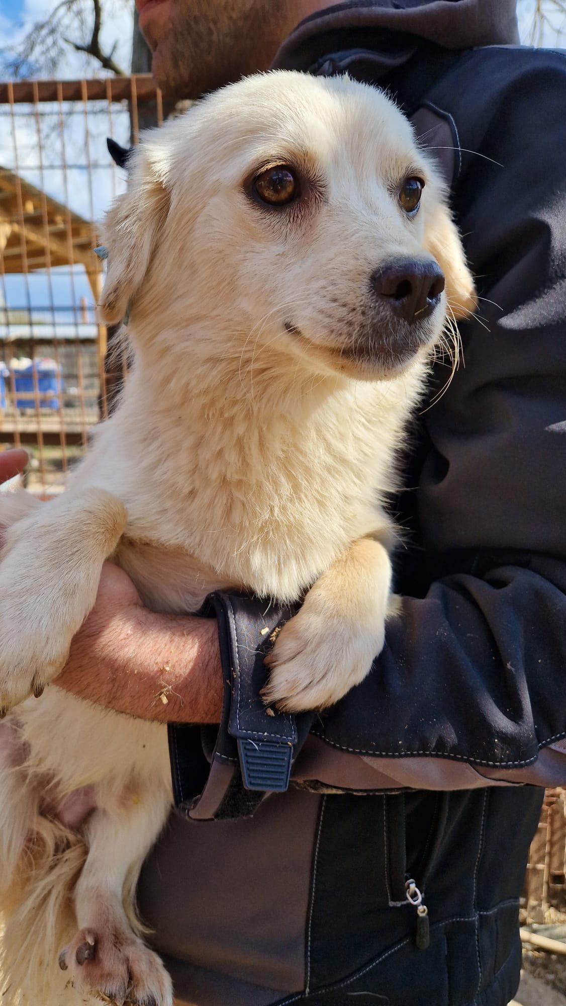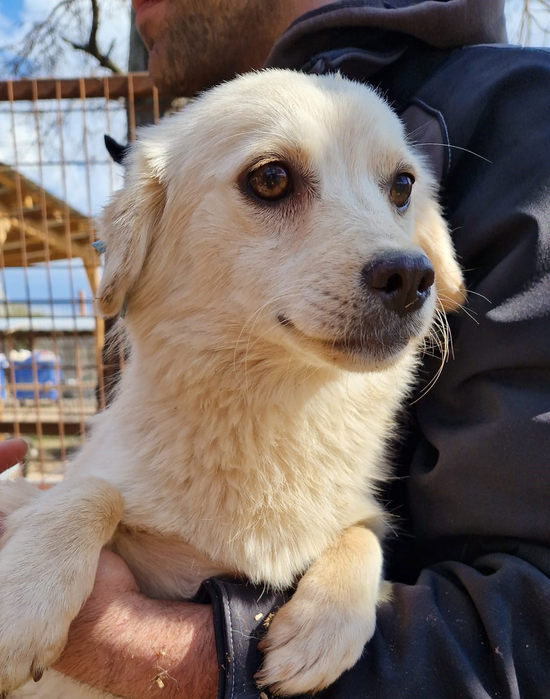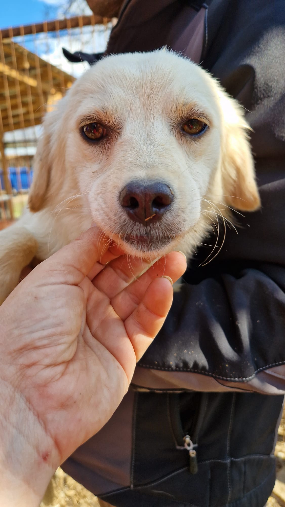 Der kleine CARMEL saß nur in der Hütte, als wir im Kennel standen, und traute sich trotz seiner Neugier nicht, heraus zu kommen. Leckerchen nahm er aber aus der Hand. Ein Arbeiter hat ihn dann für uns aus der Hütte geholt, da ein anderer Hund in dieser Hütte uns nicht mochte und dies deutlich kund tat.