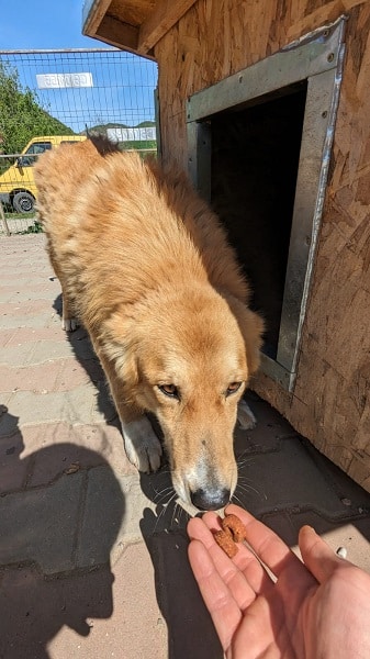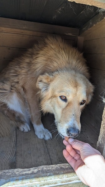 Wesen & Zutraulichkeit (Character & Trustworthiness) | freundlich (friendly), anfassbar (touchable), nimmt Leckerchen (takes goodies), letzter Vertrauensschritt fehlt (last step of confidence is missing), unsicher (insecure), braucht Zweithund (needs second dog) |