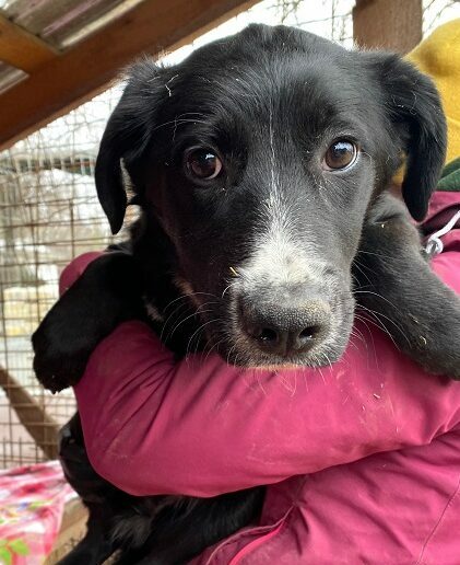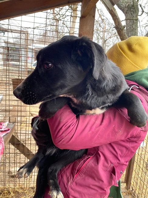 Die schüchterne CARRY hat sich erstmal in ihre Hütte verkrümelt, als wir ihren Kennel betraten. Sie ist Menschen gegenüber noch unsicher und zurückhaltend. Sie war zu gestresst, um Leckerlis von uns anzunehmen, allerdings konnten wir sie auf den Arm nehmen und streicheln. Genießen konnte sie es aber nicht wirklich.