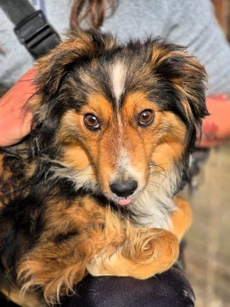 Der kleine Rüde saß sehr beeindruckt in seiner Hütte und beobachtete uns skeptisch. Leckerchen nahm er jedoch gleich gerne, ließ sich dann auch anfassen und den Chip auslesen.
