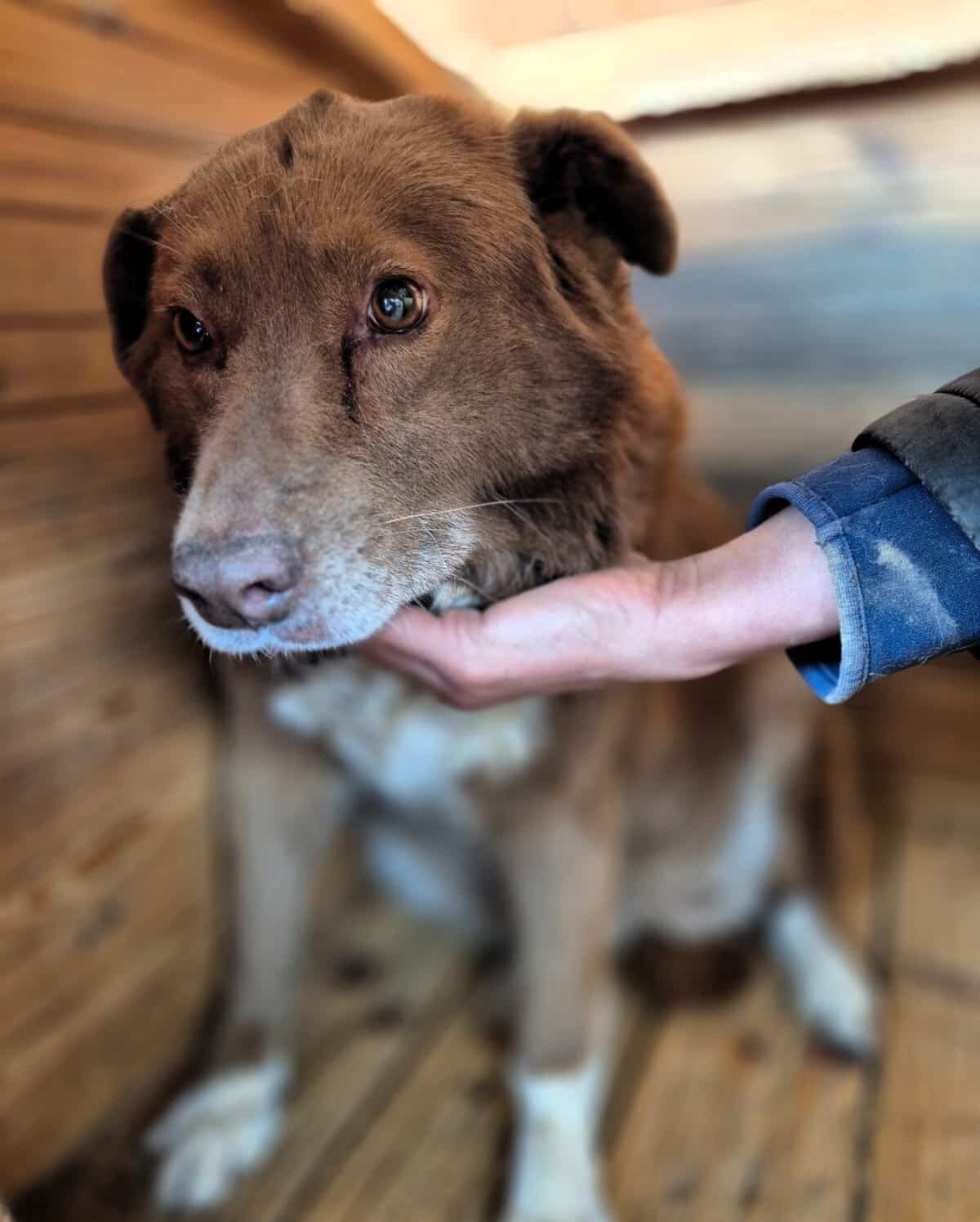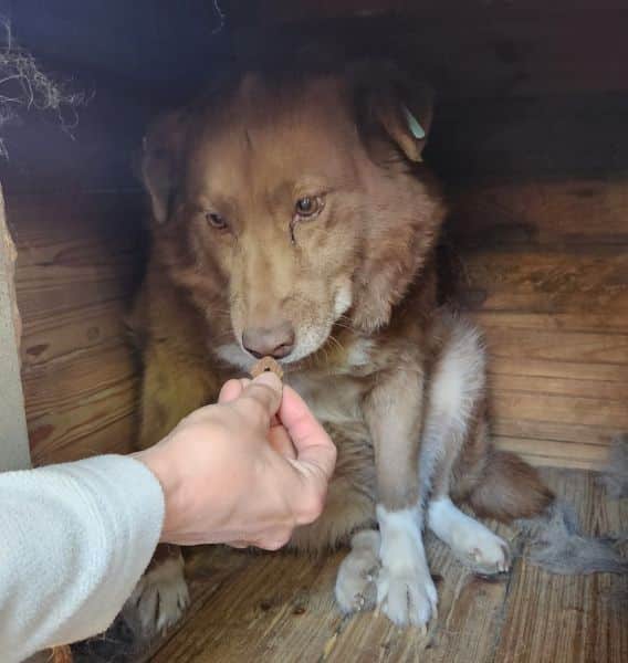 Die hübsche CHANA wollte während unseres Besuchs nicht aus der Hütte kommen. Sie ist nach wir vor zu dick und an Po und Rute machen sich deutliche Hautprobleme durch kahler Stellen bemerkbar. Auch wenn sie mit uns keinen Kontakt suchte, so ließ sie sich in der Hütte dennoch gut von uns streicheln. Die angebotenen Leckerchen nahm sie anfangs nur vom Boden, mit etwas Überzeugungsarbeit dann aber auch vorsichtig aus der Hand.