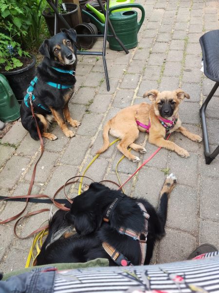 Mit unseren Katzen teilt sie ein Körbchen, mit den anderen Hunden ebenfalls. Am liebsten allerdings mit ihrer Ziehmama Lila. Zu ihr schaut sie auf, ihre Führung hat sie noch niemals in Frage gestellt.