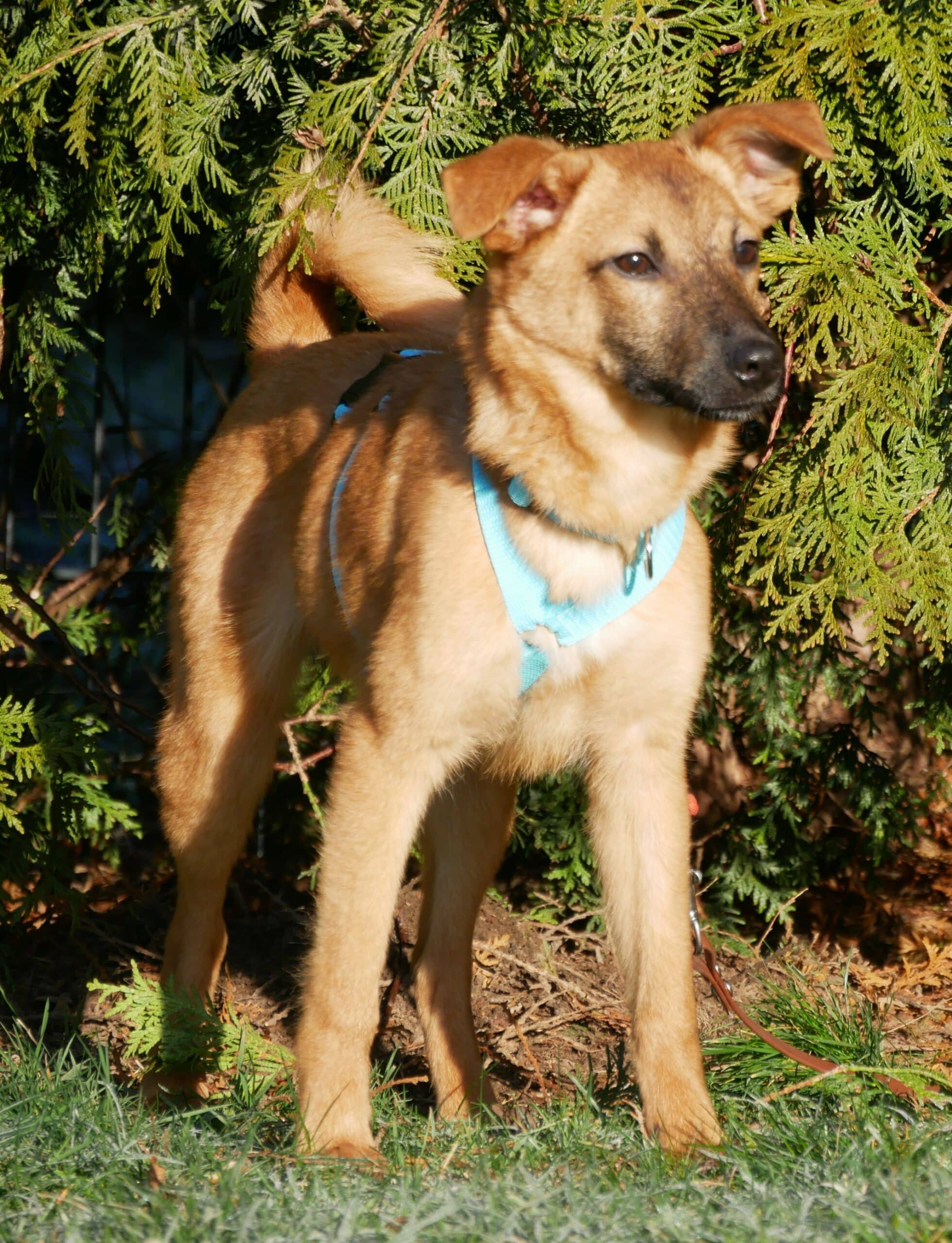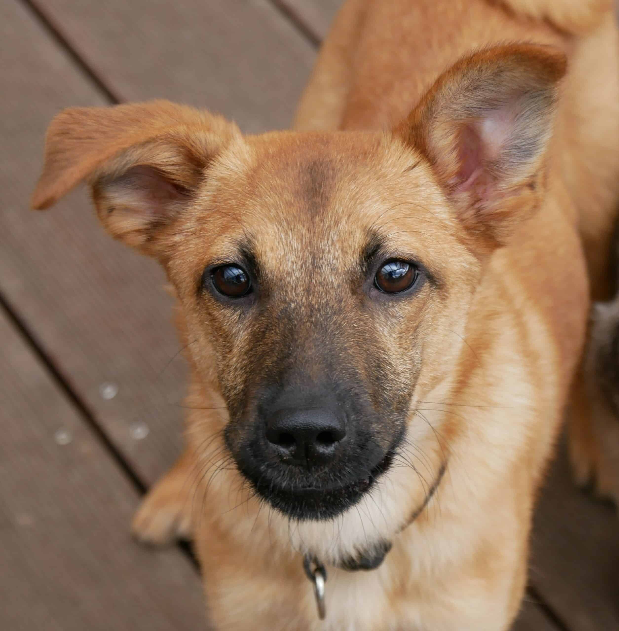 Weiches Flauschfell in hellbraun, dunkler Fang, seitliche Stehknicköhrchen und die Rute über dem Rücken getragen