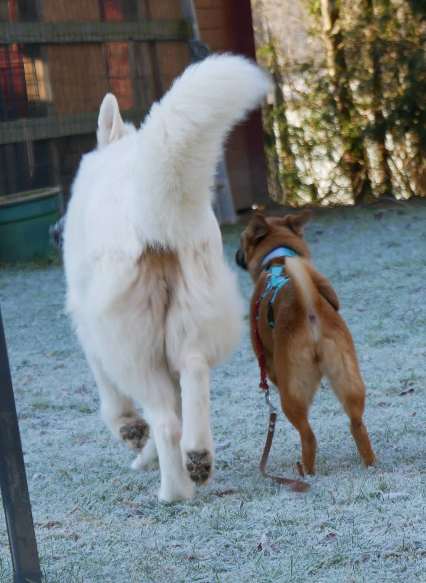 Jedoch gibt es auch immer noch viele Momente und Situationen, die ihr nicht geheuer sind oder denen sie sich noch nicht stellen mag. Aber sie hat gelernt, dass Mensch ihr einen verlässlichen Schutz bietet und ihr Rückendeckung gibt. Sie flüchtet dann zwar immer noch; jetzt aber in die Arme ihres Menschen. Die müssen dann punktgenau bereit sein und dürfen nicht zögern. Dann kann sie verschnaufen und sich sammeln. Wenn sie fertig damit ist, kommt ein Schütteln und es kann weitergehen. Als Team.