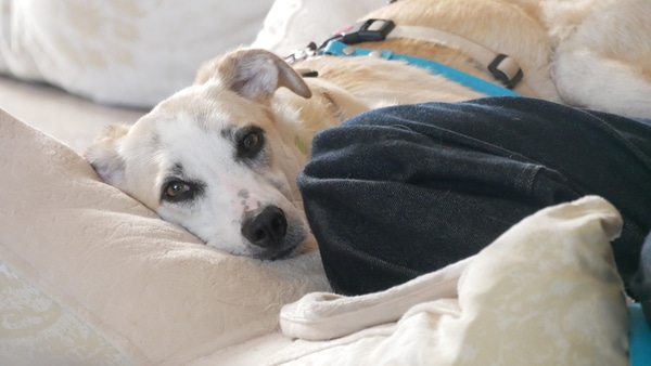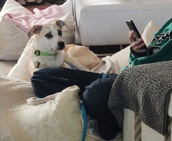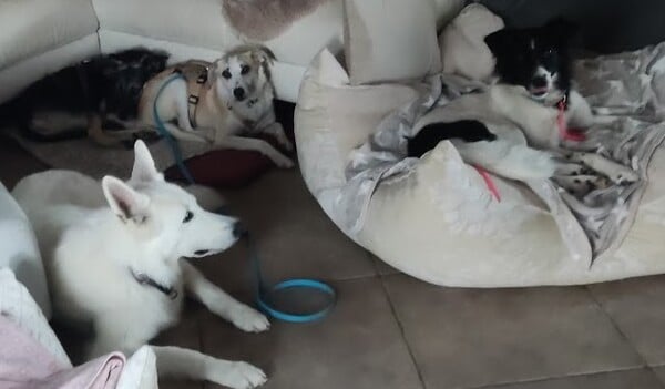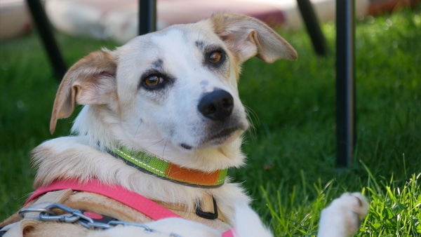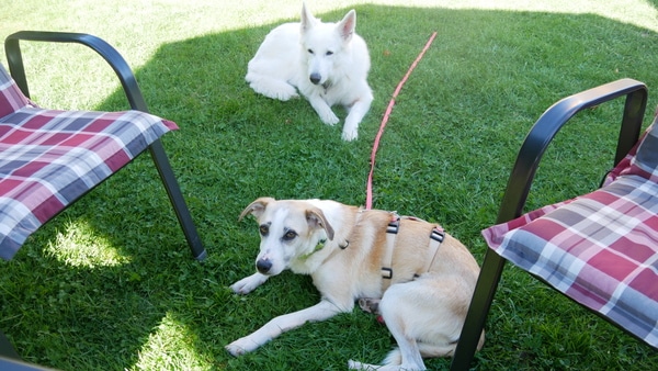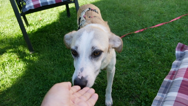 Zum spielen im Garten ist er noch nicht bereit; da beobachtet er lieber und holt sich Rückendeckung beim Pflegefrauchen. Das wird bestimmt mit der Zeit auch noch kommen. Genau wie das Bellen; aktuell haben wir das noch nicht hören können. Er lebt hier als Hahn im Korb im Hündinnenrudel und kommt damit sehr gut klar. Mit seinem sanften Wesen und den kajalumrandeten Augen passte er sowieso wunderbar in die Mädelstruppe. Chusu kommt im Haus schnell zur Ruhe; eine gute Voraussetzung für z.B. Begleitung ins Büro oder Home Office. Er ist stubenrein, markiert weder im Garten noch auf der Gassirunde, kann eine angemessene Zeit alleine bleiben, macht nichts kaputt (einzige Ausnahme: sein Geschirr – das findet er überflüssig), dekoriert nichts um, ist nicht futterneidisch, ich kann ihm jederzeit Dinge wieder abnehmen, ist katzenverträglich. Ich kann Chusu überall anfassen, Krallen schneiden, bürsten, hochheben. Beim Tierarzt wurde ihm etwas Zahnstein entfernt; auch das hat er sehr lieb über sich ergehen lassen. Bett, Sofa und Katzenfutter sind hier tabu und überhaupt (noch?) kein Thema für Chusu.