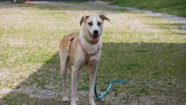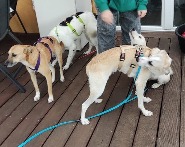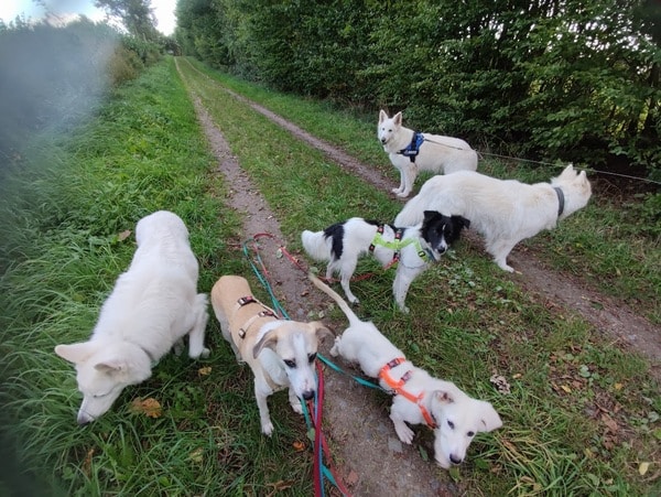 Die ersten Gassigänge waren noch sehr zögerlich; heute findet er es schön rauszukommen und geht sehr manierlich im guten Leinenradius mit. Er zieht und zergelt nicht, ist aufmerksam, schnuppert, kann sich lösen. Entgegenkommende Menschen und Hunde sind zunächst noch etwas suspekt und er wartet lieber ab; sind die aber ruhig und gelassen, wird er es auch. Am schönsten ist es dann, wenn wir gemeinsam weitergehen.