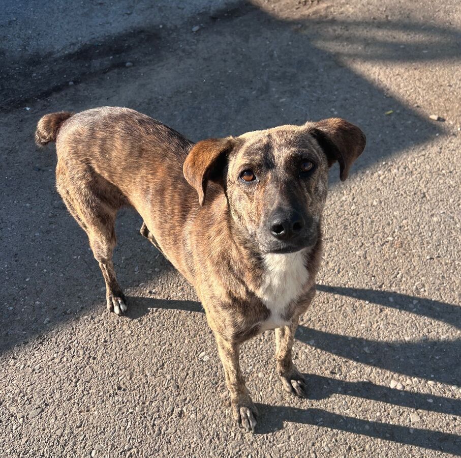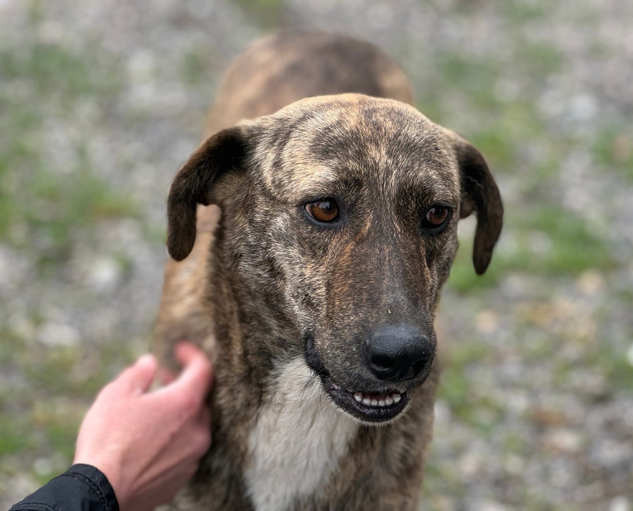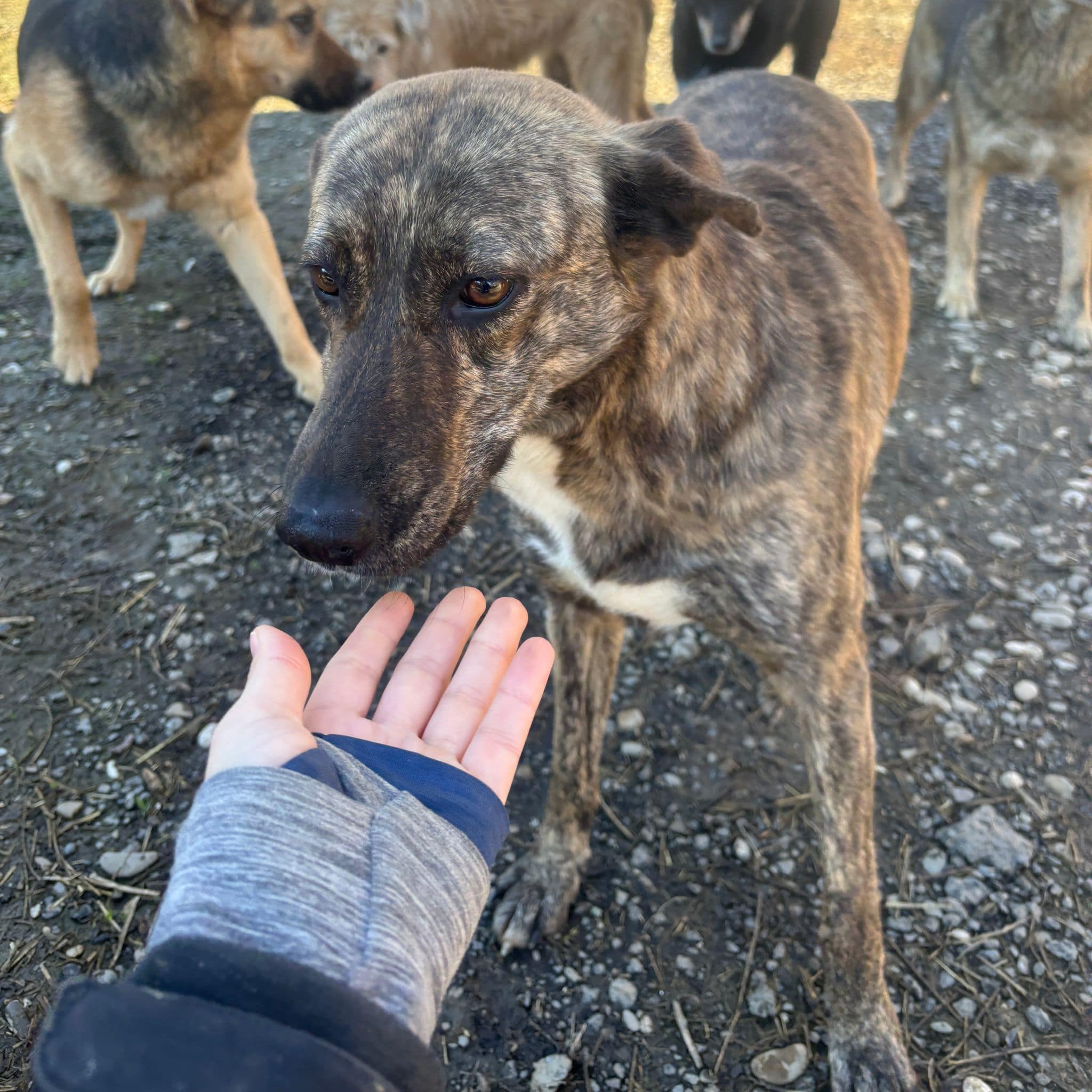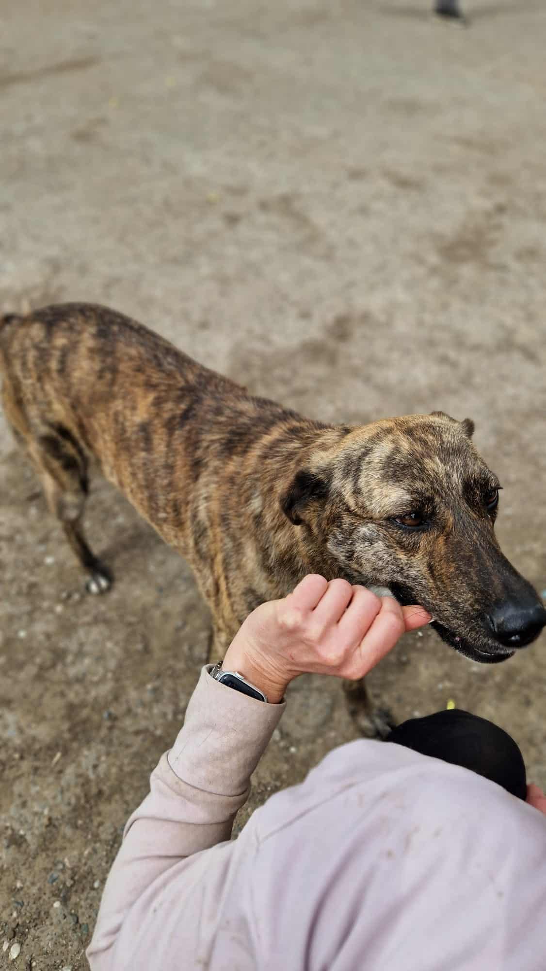 CLAIRE lebt im großen Shelter nun frei im Yard. Dort näherte sich uns die wunderschön gestromte Hündin mit der niedlichen Stummelrute ganz unaufdringlich und freute sich rührend über die Aufmerksamkeit, die Leckerlie und die sanften Streicheleinheiten. Mit den anderen freilaufenden Hunden zeigte sie sich souverän und verträglich.