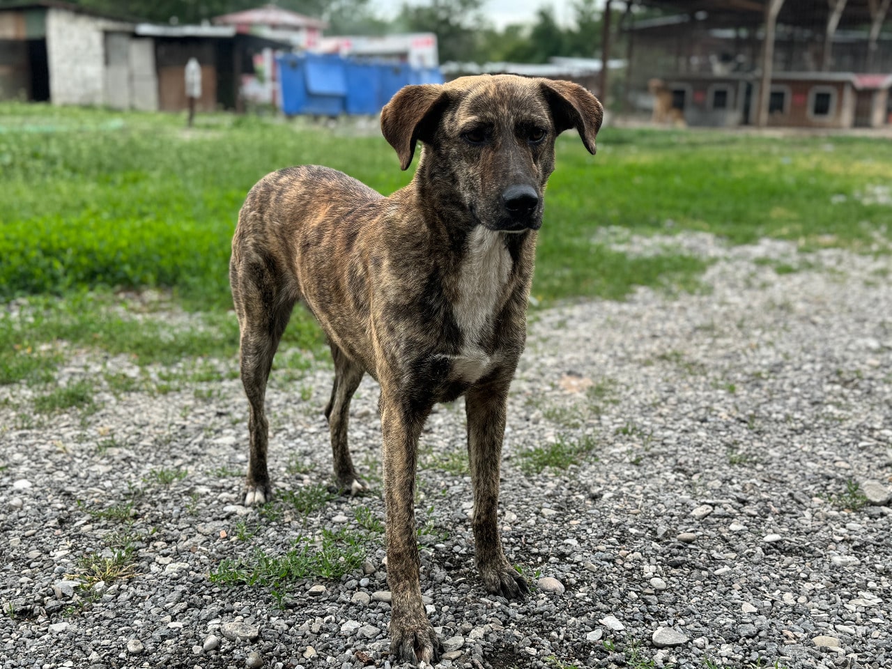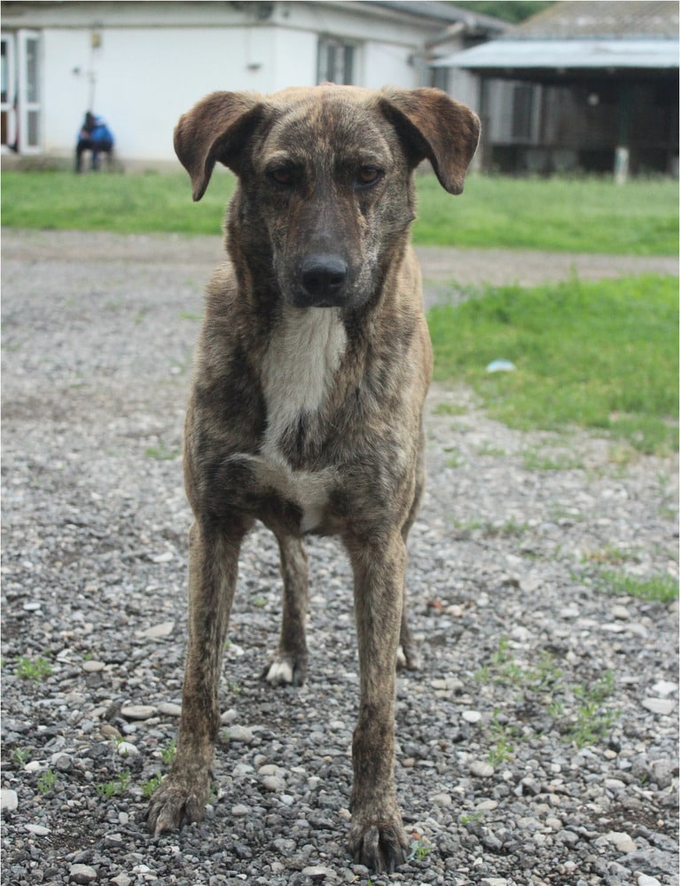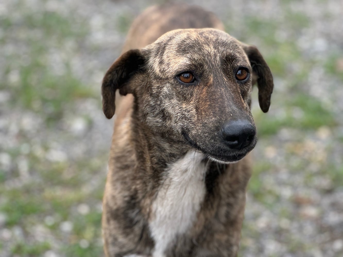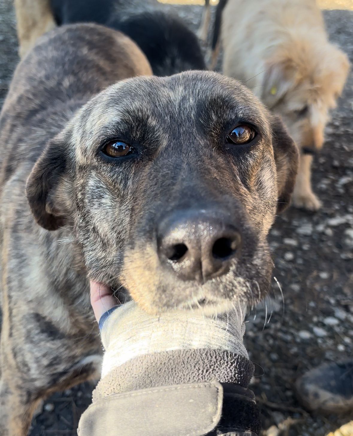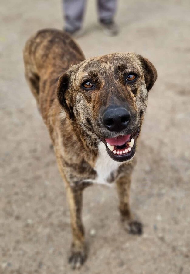 CLAIRE lebt im großen Shelter nun frei im Yard. Dort näherte sich uns die wunderschön gestromte Hündin mit der niedlichen Stummelrute ganz unaufdringlich und freute sich rührend über die Aufmerksamkeit, die Leckerlie und die sanften Streicheleinheiten. Mit den anderen freilaufenden Hunden zeigte sie sich souverän und verträglich.