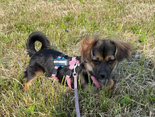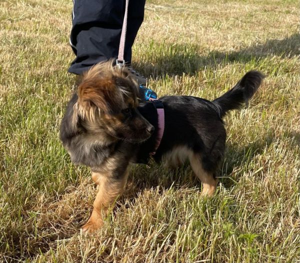 Spaziergänge machen ihr zunehmend Freude, und sie läuft schon prima an der Leine. Auch Autofahrten meistert sie entspannt und zeigt sich gegenüber Umweltreizen gelassen.