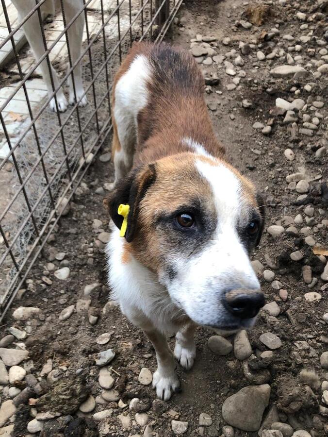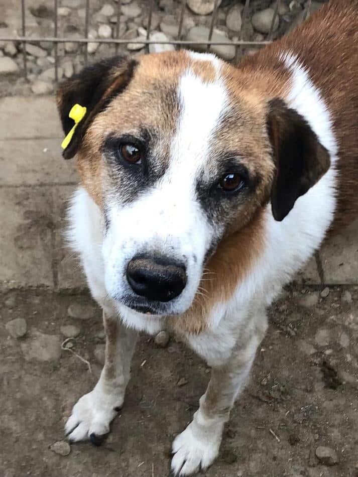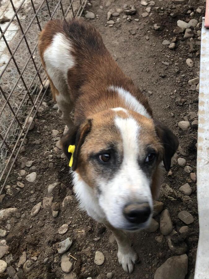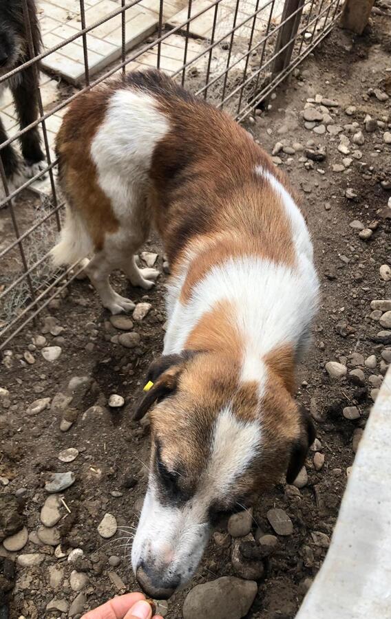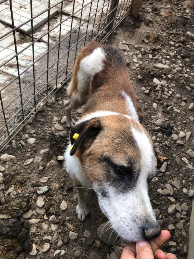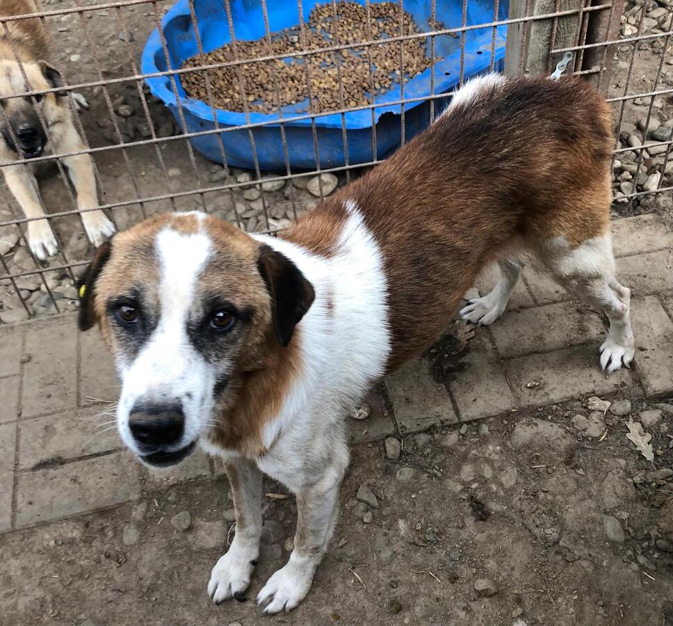 Hinter der Hütte haben wir den stark untergewichtigen Rüden CLINT liegend und teilnahmslos vorgefunden. Ganz vorsichtig, aber zügig hat er die angebotenen Leckerchen verschlungen, es scheint als hätte er schön längere Zeit kein Futter mehr bekommen. Nach kurzer Zeit kam CLINT näher und ließ sich dann zuerst an Schnauze und dann am restlichen Körper streicheln, ohne auszuweichen. Als die Leckereien aufgegessen waren, hat er auch weiterhin die Nähe der Volontärin gesucht.