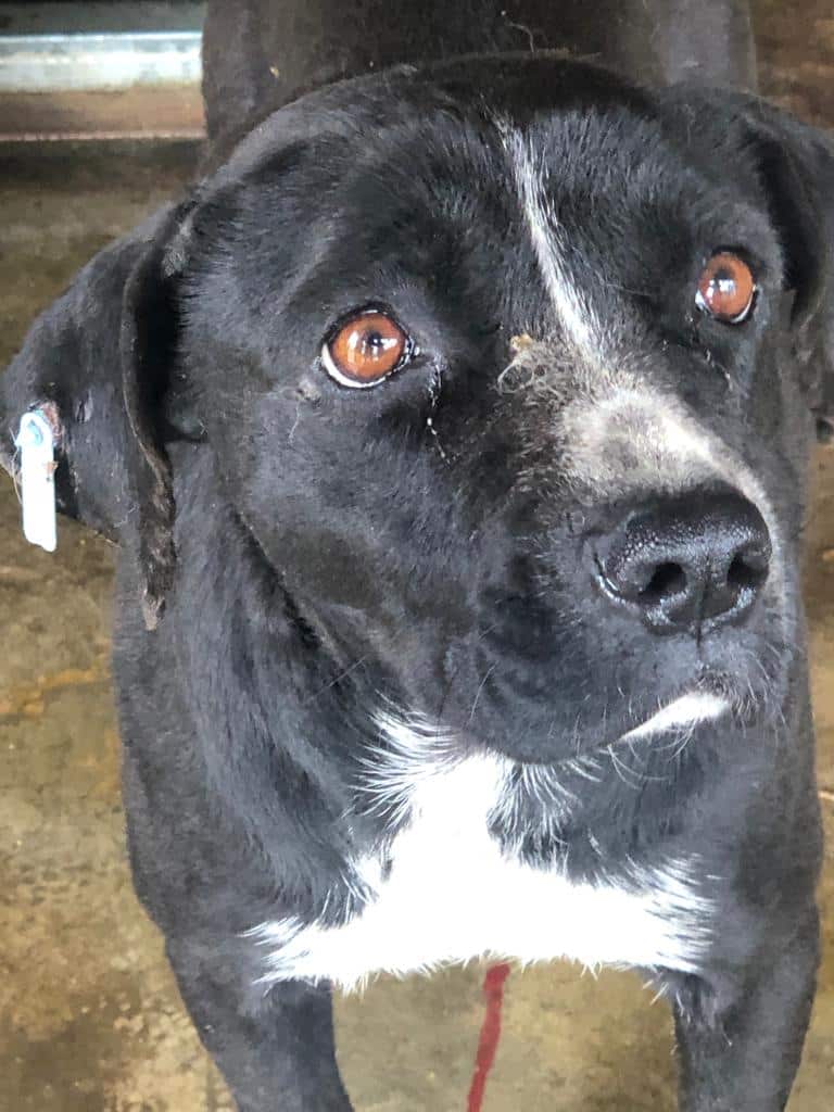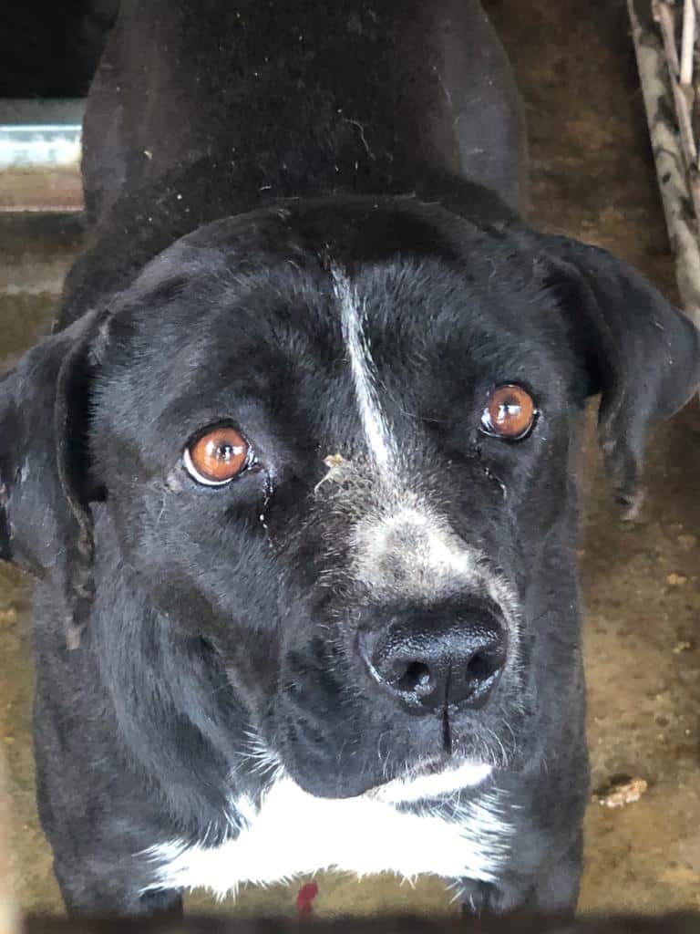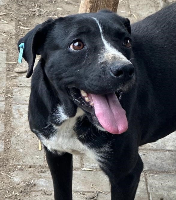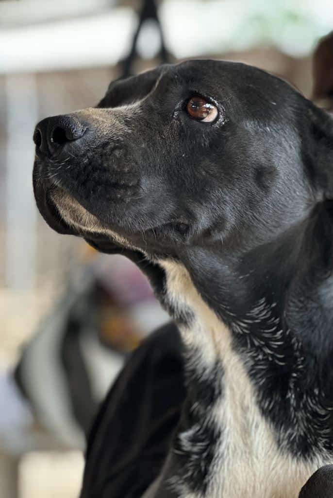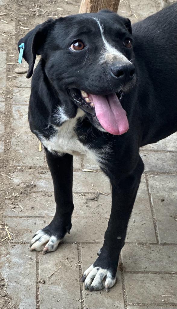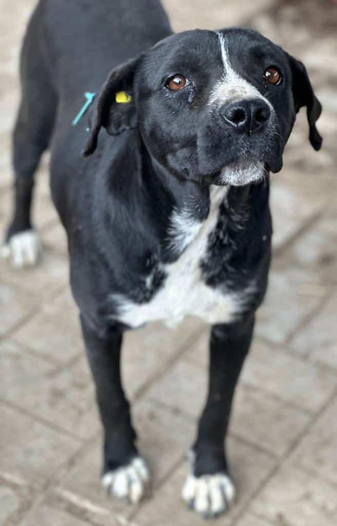 Die süße, schwarze-weiße Lady mit möglichen Boxer-Molosser-Genen suchte im engen VetKennel von sich aus den Kontakt zu uns. Wir konnten sie überall anfassen, sie nahm Leckerchen und zeigte sich in der Gruppe verträglich. Früher hatte sie einmal Welpen gehabt.