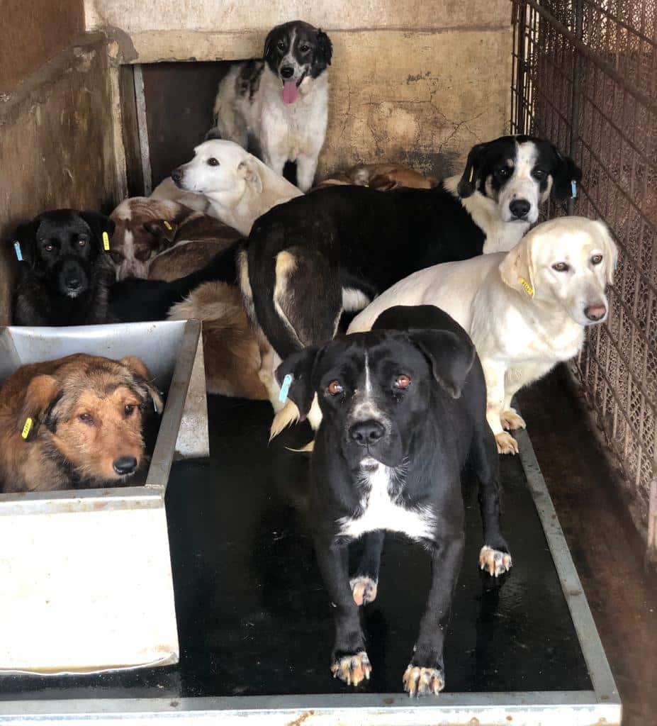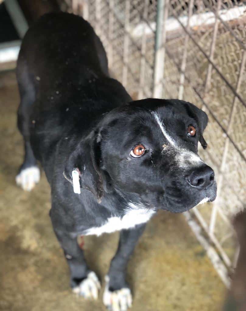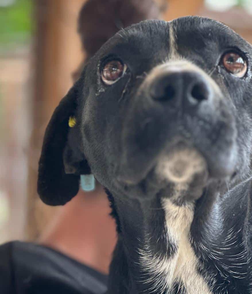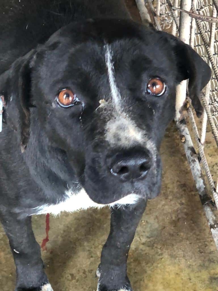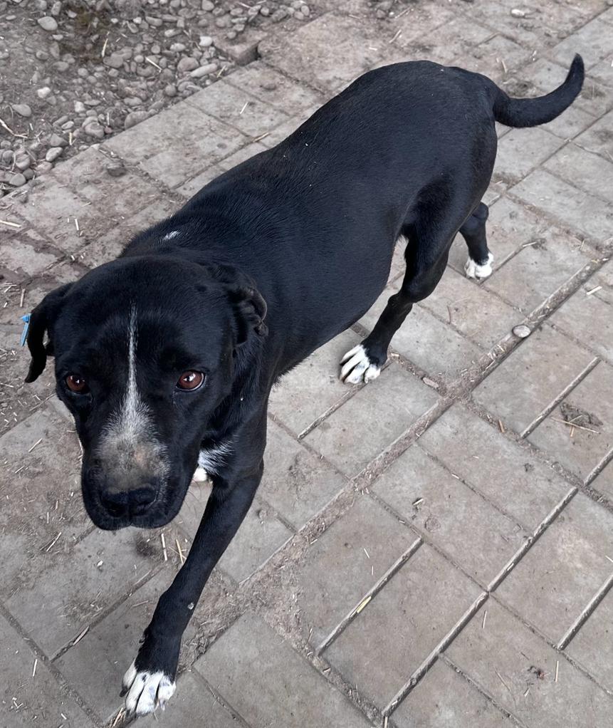 Die süße, schwarze-weiße Lady mit möglichen Boxer-Molosser-Genen suchte im engen VetKennel von sich aus den Kontakt zu uns. Wir konnten sie überall anfassen, sie nahm Leckerchen und zeigte sich in der Gruppe verträglich. Früher hatte sie einmal Welpen gehabt.