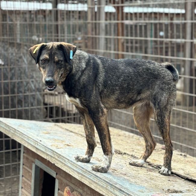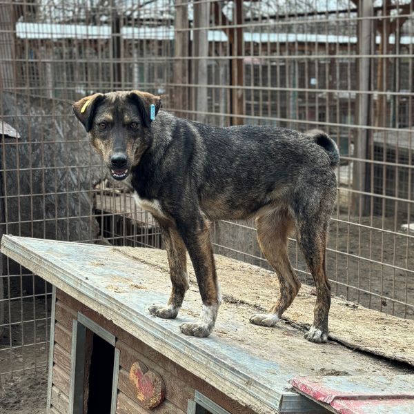 Diese hübsche Hündin mit der tollen Fellzeichnung und der niedlichen Ringelrute zeigte sich bei unserem Besuch sehr freundlich und interessiert. Gern kam CONTESSA immer wieder in unsere Nähe – hielt jedoch stets einen Sicherheitsabstand ein – und nahm die hingeworfenen Leckerlie dankbar an. Für mehr Kontakt fehlte ihr leider der Mut und so wich CONTESSA den Annäherungsversuchen unsererseits aus. Zuwendung wird ihr einfach fremd sein. Als es Zeit war für die allgemeine Mittagsruhe, legte sie sich entspannt in unserer Nähe auf ein Hüttendach und döste.