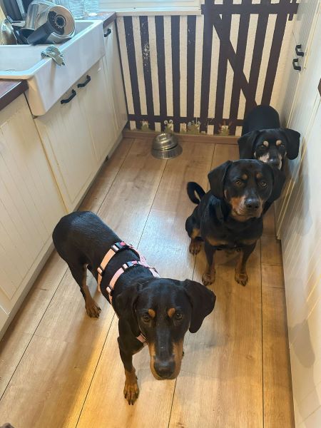 Das Katzen im Haushalt nicht gejagt werden hat sie trotz des ausgeprägten Jagdtriebes akzeptiert. Corinna ist im Haus ruhig, draußen im Garten dreht sie gerne auf, buddelt und tobt mit den anderen Hunden.