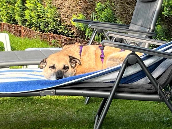 Cory ist ein richtiger „Gute Laune“ Hund und sie bringt uns hier täglich zum Lachen. Sie entdeckt mit Begeisterung ihre neue Welt und hat inzwischen noch weitere Hobbys für sich entdeckt, Sonnenbaden gehört z.B. ganz oben auf ihre tägliche „To Do“ Liste , dicht gefolgt vom im Gras wälzen usw. Spaziergänge sind auch toll, egal ob im Wald, zwischen Wiesen oder in der Kleinstadt. Souverän geht sie z. B. an großen Ungeheuern (Kühe) vorbei, schnelle und laute Blechkisten sind auch nicht schlimm.