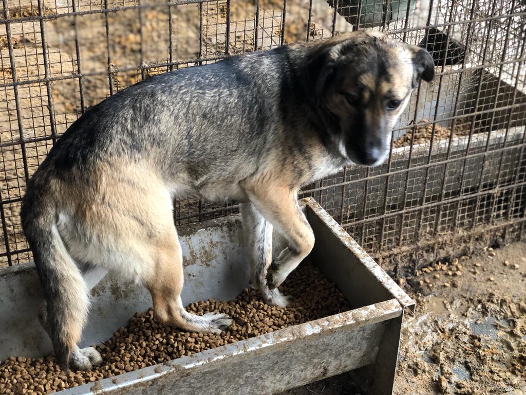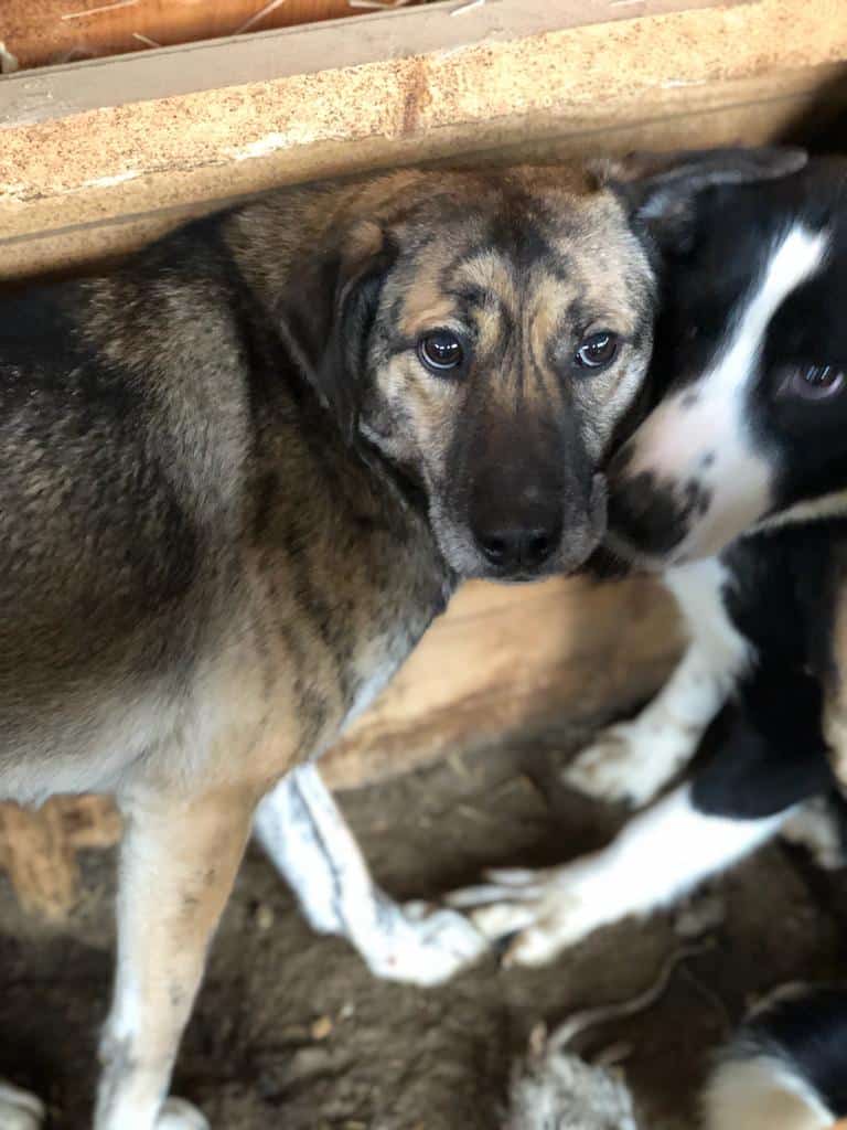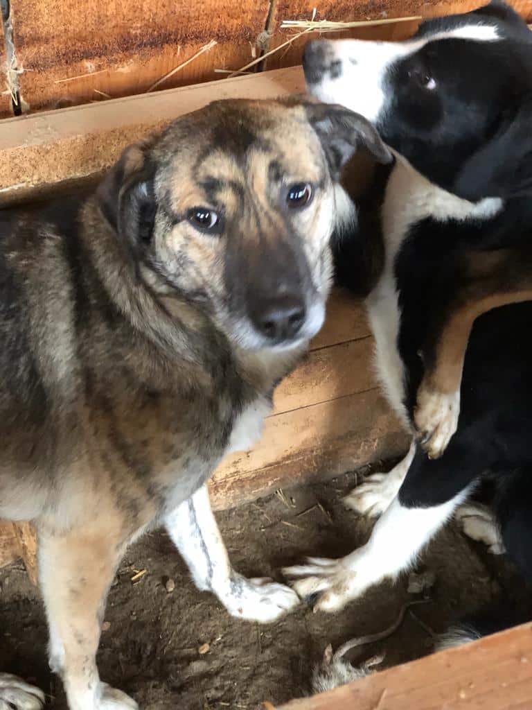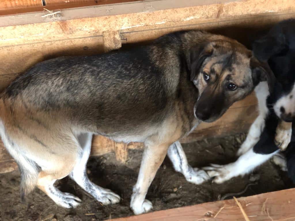 Zu Dritt leben sie in einem kleinen Kennel. Diese wunderschöne, gestromte Hündin versuchte, sich vor uns zu verstecken. In dem kleinen Kennel unmöglich. Unter unseren Anfassversuchen erschrak sie und ist geflüchtet. Für diese etwas scheue Hündin bedarf es viel Hundesachverstand. Weiterer Hund ist ebenfalls ein Muss.