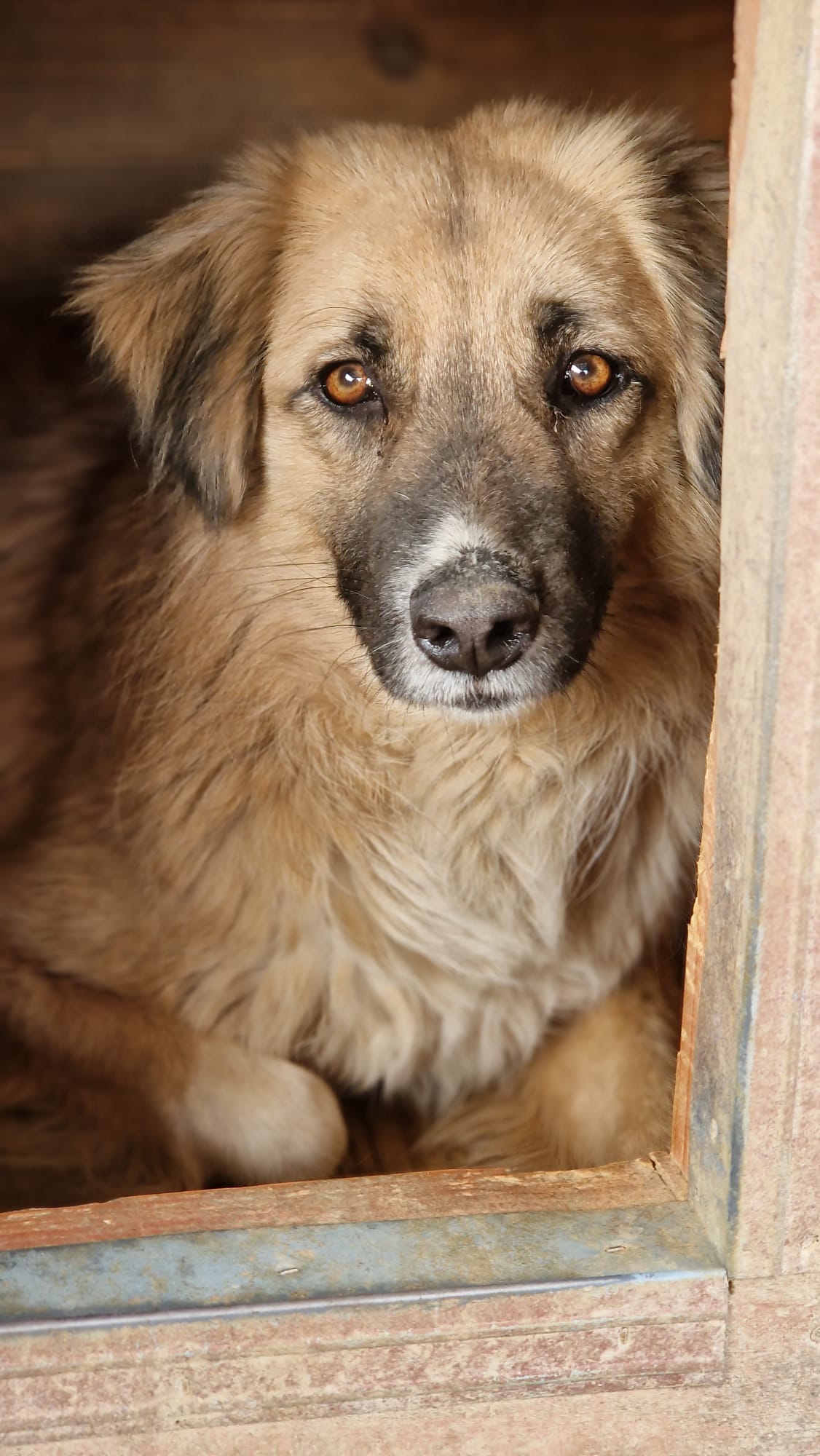 CROWN zeigte sich bei unserem Besuch endlich außerhalb der Hütte. Da stand doch plötzlich eine wunderschöne Hündin vor unserer Kamera und schaute, als würde sie sich selbst darüber wundern. Sie beobachtete die anderen Hunde und schien sich an ihnen zu orientieren um zu entscheiden, ob Rückzug oder erstmal an Ort und Stelle stehen zu bleiben. Wir sahen davon ab uns ihr zu nähern, denn CROWN hatte einen großen Schritt gewagt, in dem sie sich aus der Hütte wagte, obwohl wir im Kennel waren. Und so können wir sagen: Hier ist endlich dein tolles Foto, liebe CROWN!