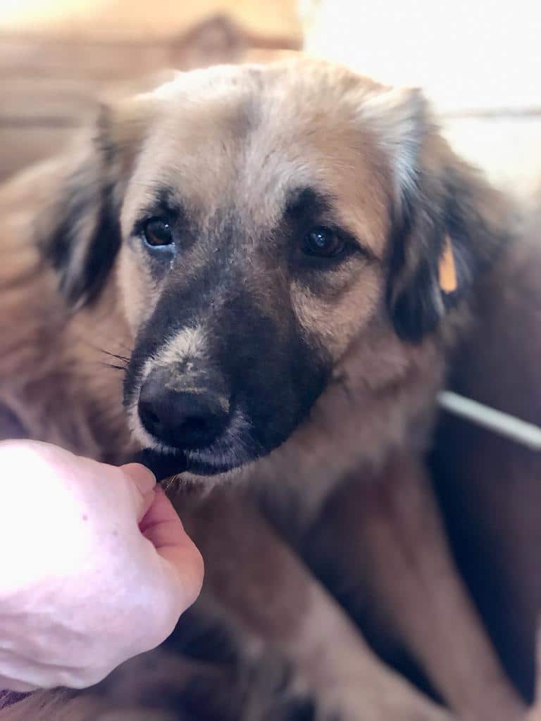 Crown lag auch dieses Mal nur in der Hütte. Sie zeigte sich unsicher, nahm aber die hingelegten Leckerli zögerlich an.
