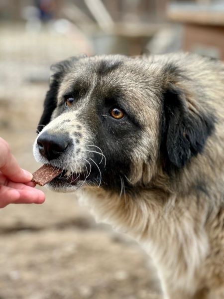 Diese Hündin hat eine ungewöhnliche Maske. Sie erinnerte uns an eine Waschbärin. Total süß. Sie lebt in einer gemischten Hundegruppe sehr verträglich und war von diesen die offenste und die einzige, die zu uns kam, um Leckerchen direkt aus den Fingern zu nehmen. Mit ausreichend sehr guter Hundeerfahrung würde man sie über Wochen/Monate sicherlich zutraulicher bekommen. Aktuell konnten wir sie noch nicht anfassen. Aufgrund der Größe und da man nicht weiß, ab wann sie spazieren gehen könnte, stellen wir uns eine ebenerdige Wohnung mit unmittelbaren Zugang zu einem gesicherten Garten/Hof vor. Sehr gerne als Zweithund.