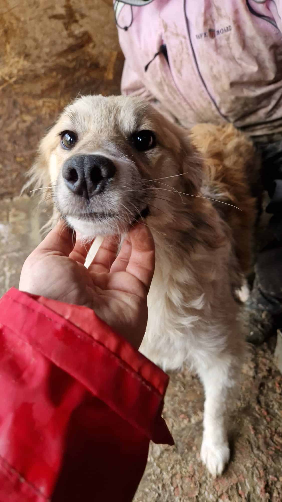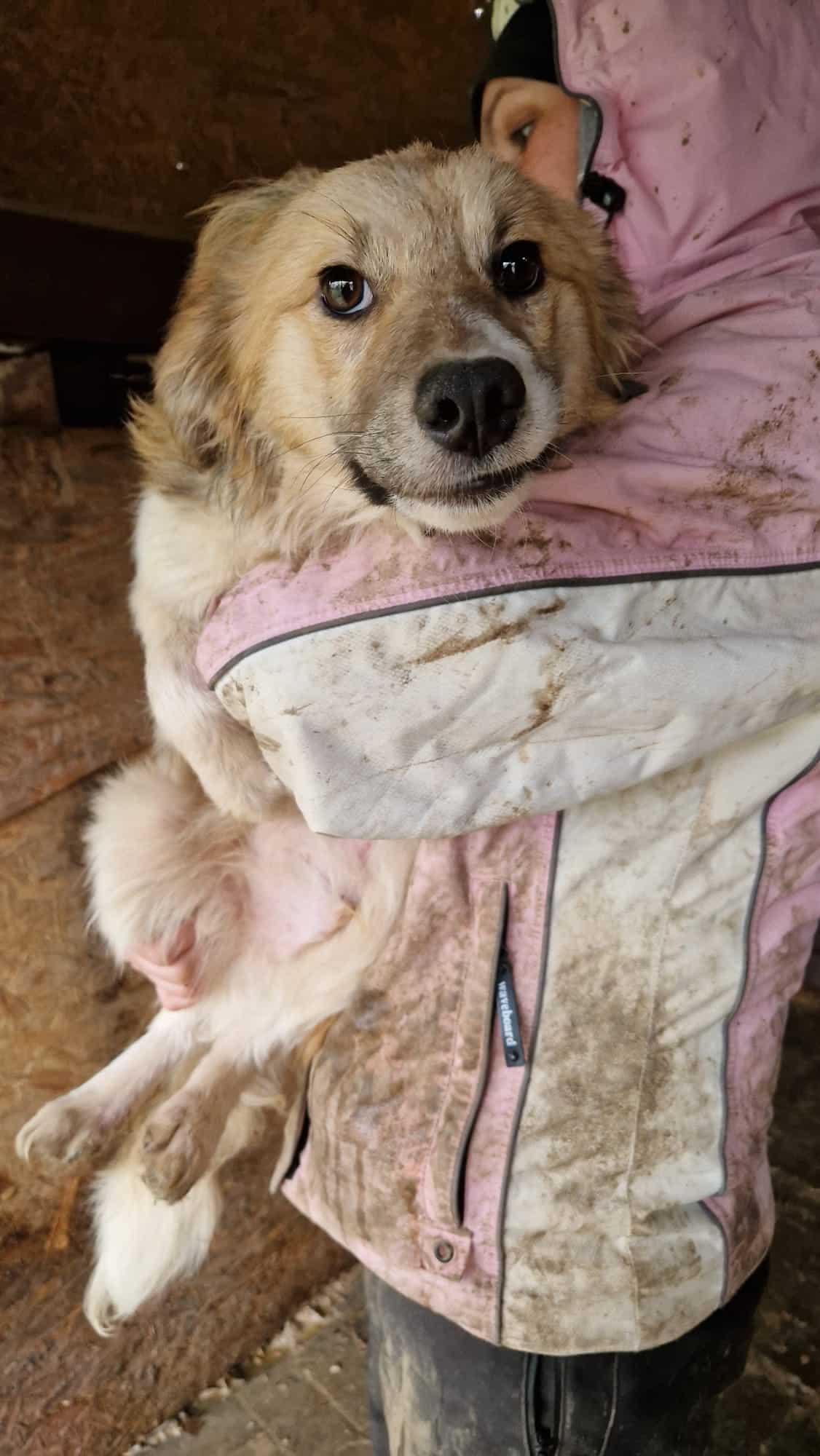 saß schüchtern in der Hütte, als wir uns mit den anderen Hunden beschäftigten – musste von uns rausgeholt werden