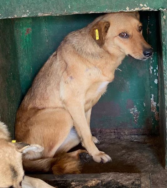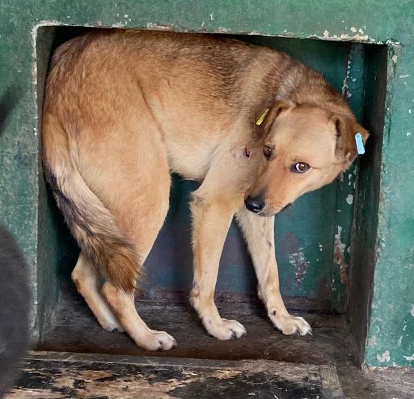 Dieser arme Rüde sitzt im Vetkennel, um schnell wieder gesund zu werden. Die Bissverletzung verunsichert ihn und von daher war er leider nicht anfassbar. Wer weiß, was der arme Kerl erlebt hat. Abwehrverhalten zeigte er nicht, er wollte einfach in Ruhe gelassen werden. Mit seinen Kennelkumpels war er verträglich.