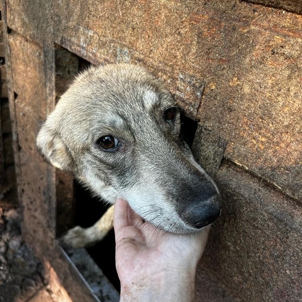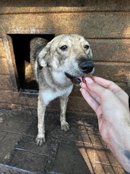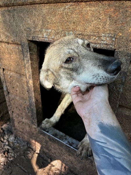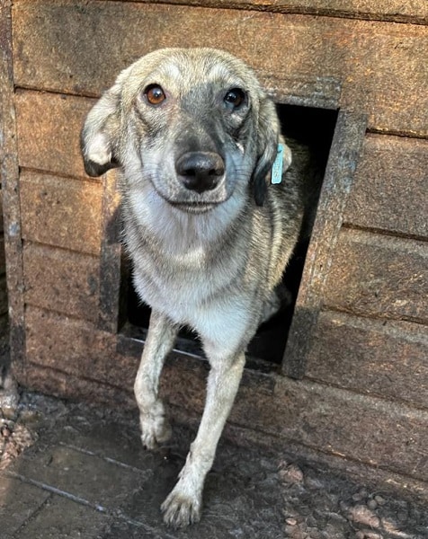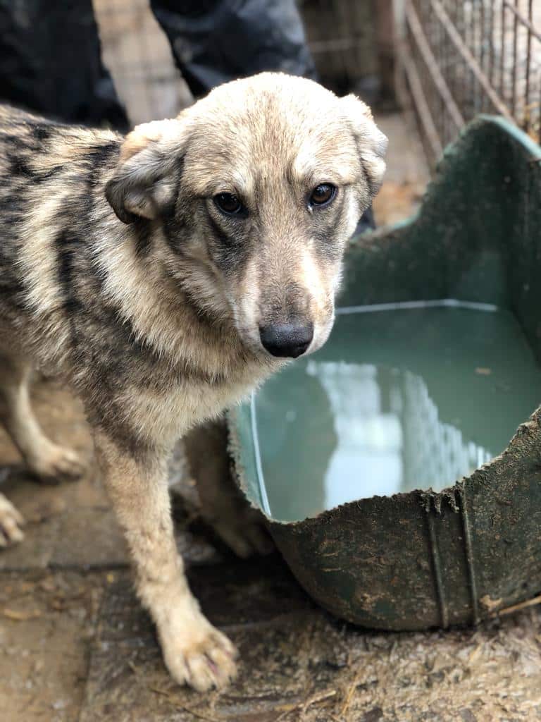 DAFNA sieht leider ziemlich fertig aus. Sie saß nur in einer Hütte, war anfänglich zurückhaltend, taut dann aber schnell auf und fand unsere Streicheleinheiten total super. Wir hoffen sehr, dass sie dem Shelter-Stress nun bald entkommt.