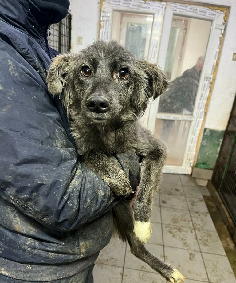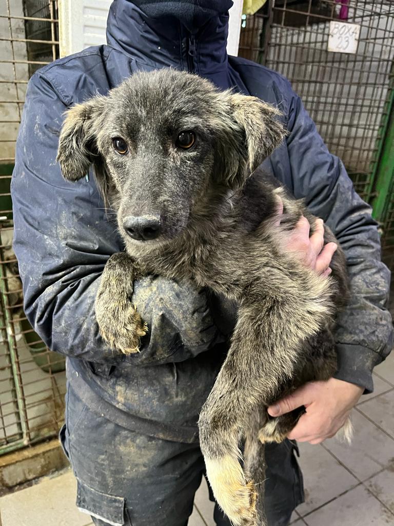 Diese freundliche Hündin sitzt derzeit (12/2023) in einem kleinen Vetkennel-Abteil und ist situativ überfordert. Sie ließ sich aber problemlos auf den Arm nehmen und gerne streicheln.