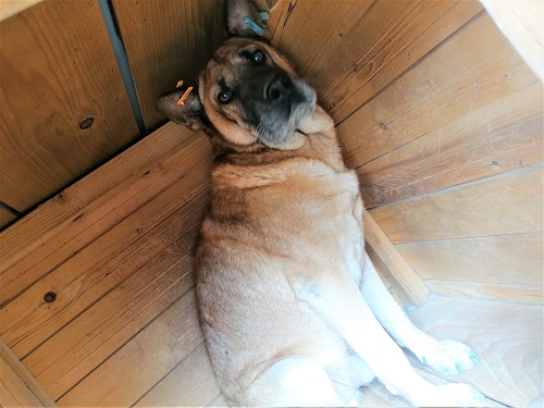 DANDY ist weiterhin etwas scheu. Panisch reagiert er nicht – ist eh eher der ruhige Typ. Unsere Leckerchen fand er interessant, aber für aus der Hand zu nehmen, reichte es nicht. Mit den Hündinnen im Kennel versteht er sich gut.