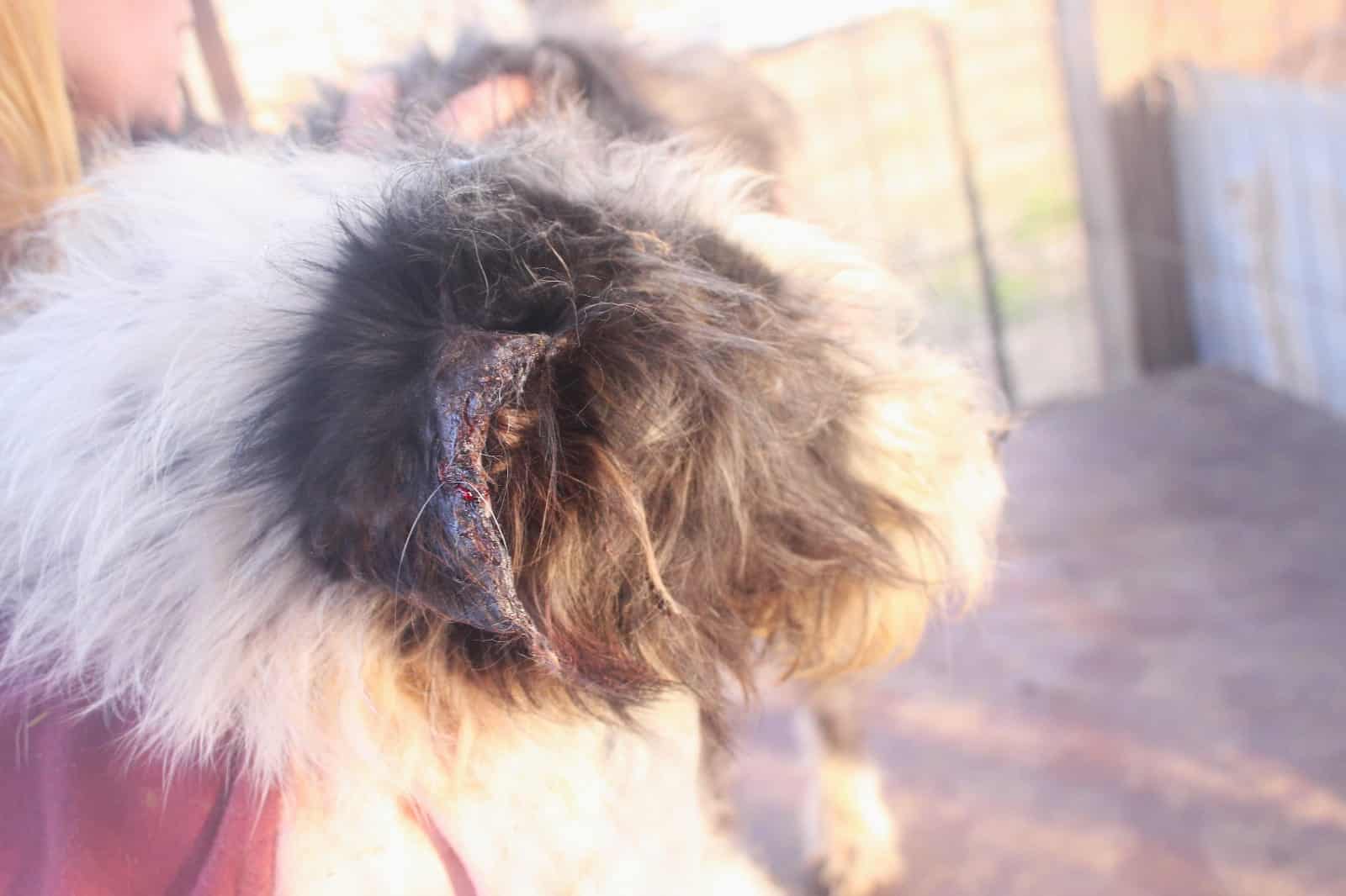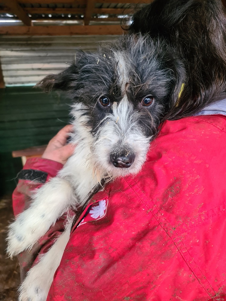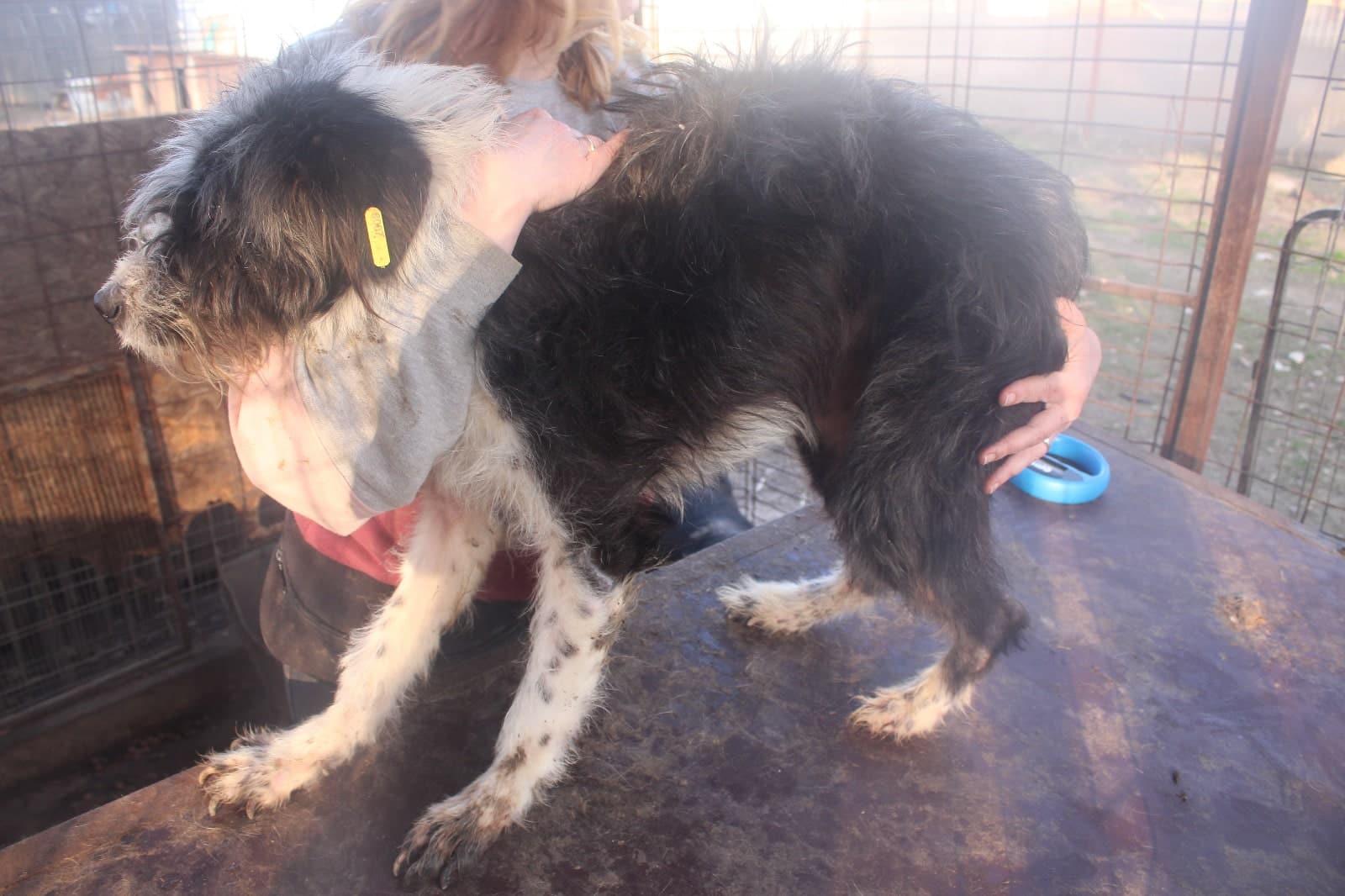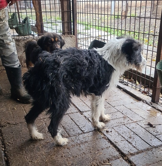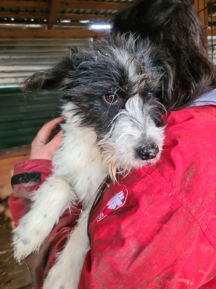 DANTE ist zum Notfall geworden. Er war vor einem Jahr schon zu dünn, auch jetzt ist er nur Haut und Knochen. Wir fanden ihn hinter der Hütte eingequetscht, unter mehreren anderen Hunden liegend. Wir konnten ihn hervorziehen und er hat alles mit sich machen lassen. DANTE hat nicht geschnappt, ist aber nach wie vor sehr unsicher, weil er einfach keinen Menschenkontakt kennt. Als wir ihn rausgeholt hatten, konnten wir erst das ganze Ausmaß sehen. Er hat Bisswunden, ein blutiges Ohr und ist unter seinem langen Fell viel zu dünn. Er sieht schrecklich aus, dabei ist er erst zwei Jahre alt.