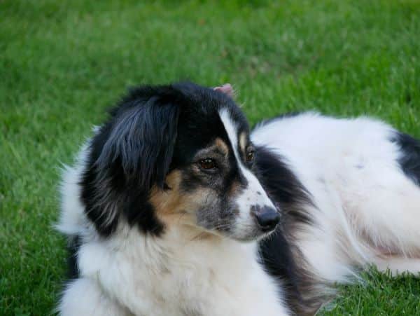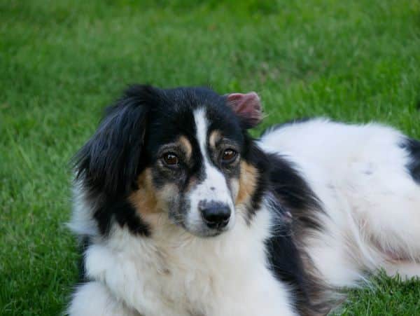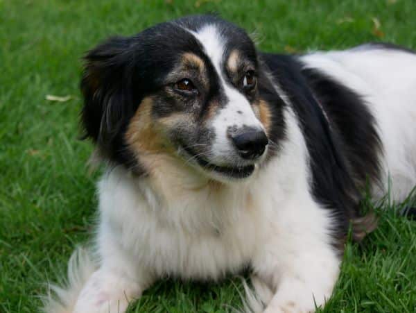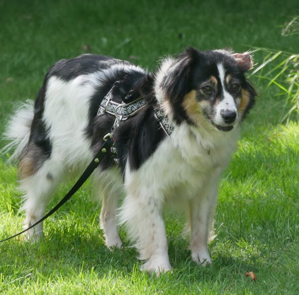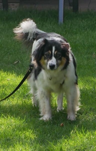 - dreifarbige Maske, schwarz weißes sehr flauschiges Fell, die fedrige Rute gerade getragen