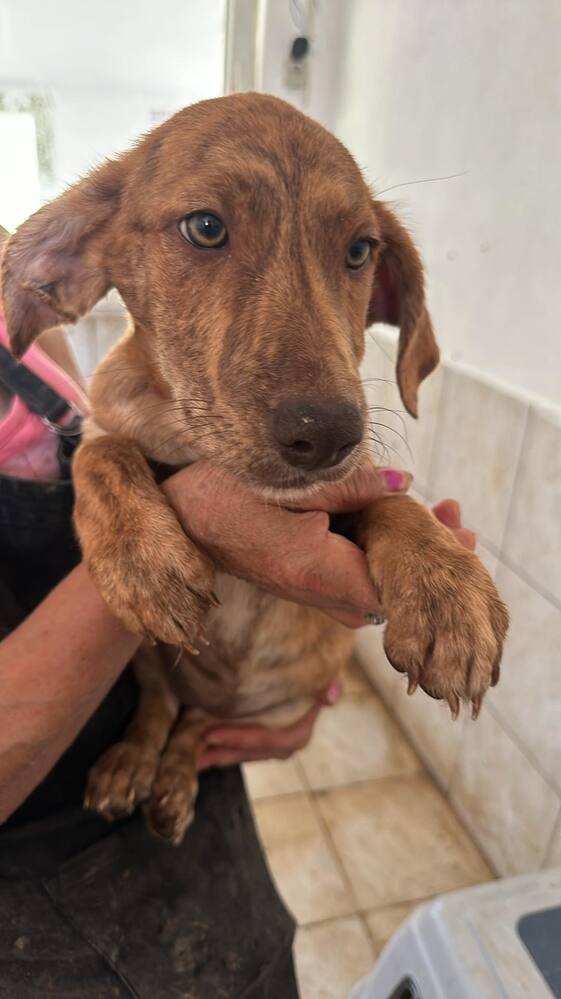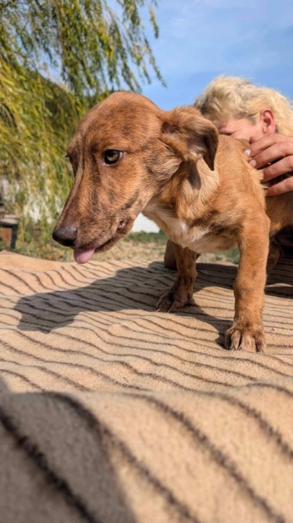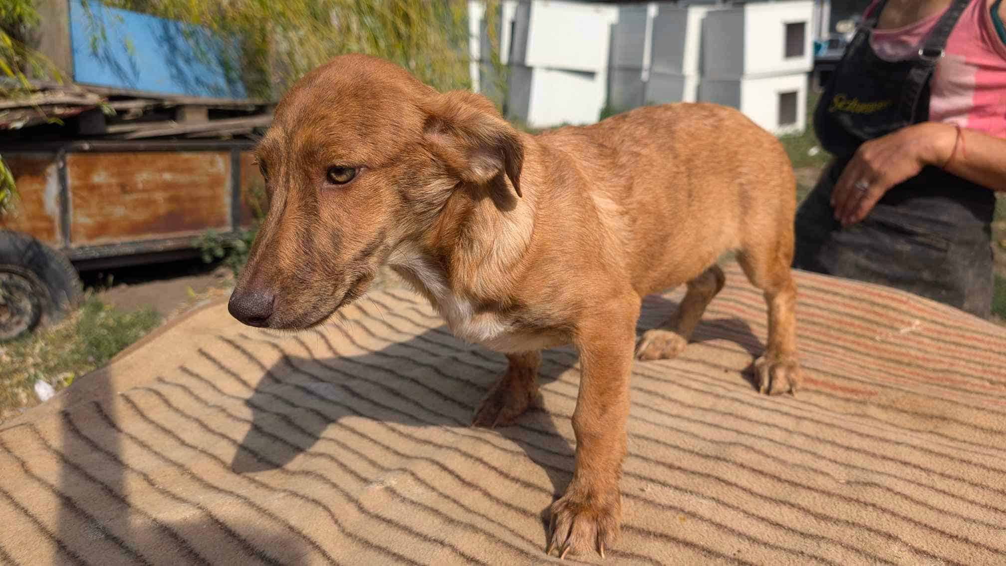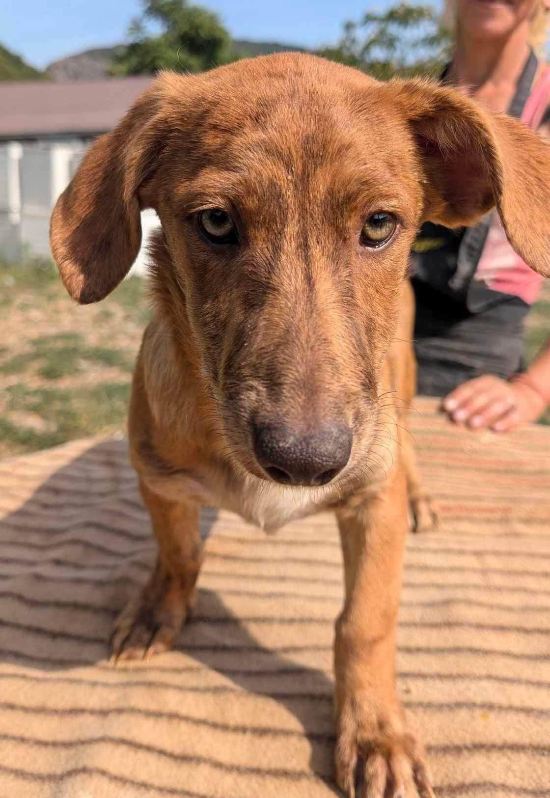 Update 08/24: Darcy ist ein süße, nette, junge Hündin. Sie liess sich auf der Decke für das Fotoshooting gut anfassen und hat alles sehr gut mitgemacht, was für ihren Charakter spricht. Sie ist sehr verträglich in der Gruppe, weiterhin offen und interessiert und sehr zutraulich. Die kleine Hündin hat ein bisschen Dackelbeine, vermutlich wird sie nicht allzu groß. Wir hoffen sehr, dass sie bald anders aufwachsen kann als in einem trostlosen Kennel.