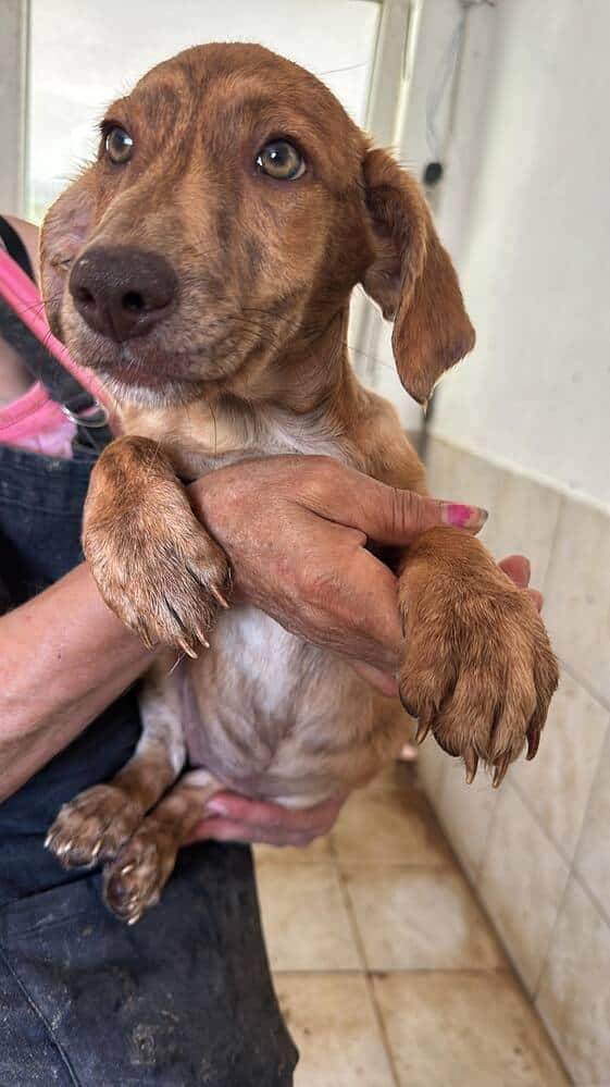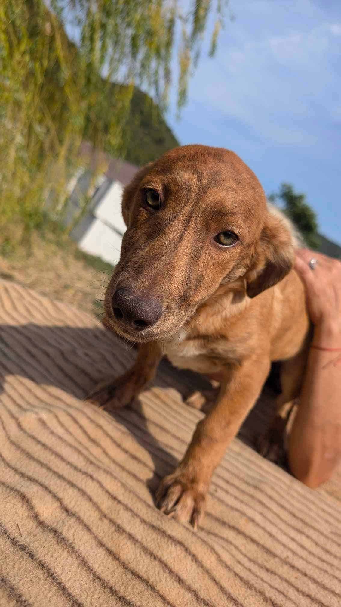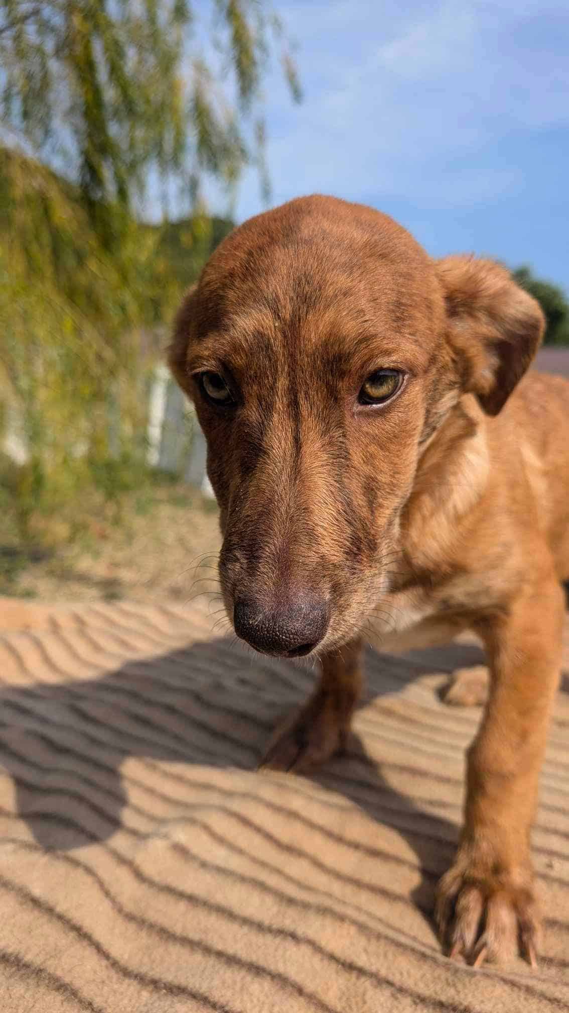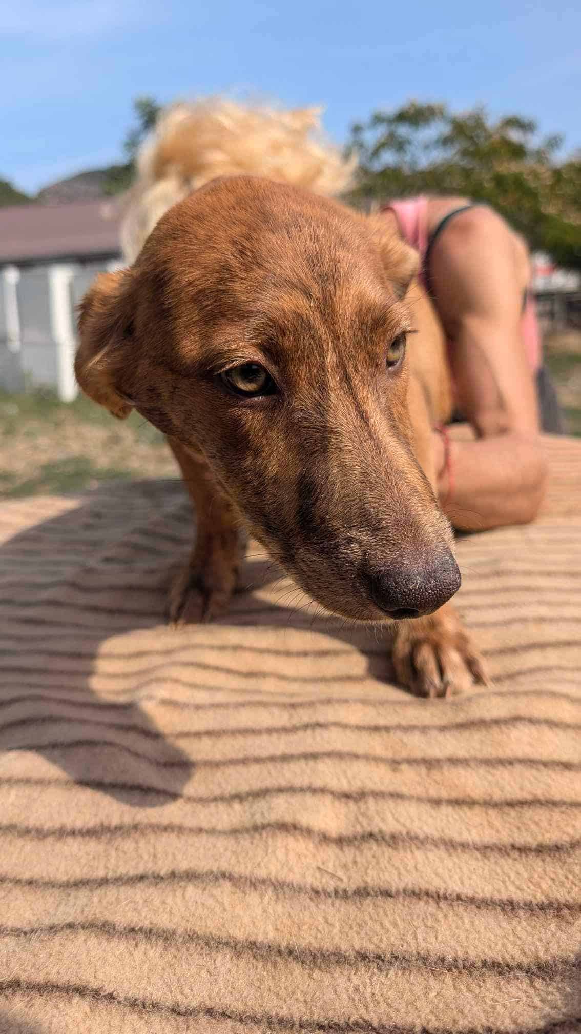 Update 08/24: Darcy ist ein süße, nette, junge Hündin. Sie liess sich auf der Decke für das Fotoshooting gut anfassen und hat alles sehr gut mitgemacht, was für ihren Charakter spricht. Sie ist sehr verträglich in der Gruppe, weiterhin offen und interessiert und sehr zutraulich. Die kleine Hündin hat ein bisschen Dackelbeine, vermutlich wird sie nicht allzu groß. Wir hoffen sehr, dass sie bald anders aufwachsen kann als in einem trostlosen Kennel.