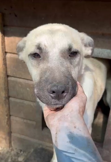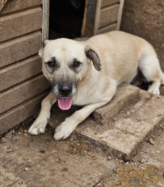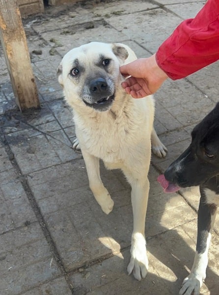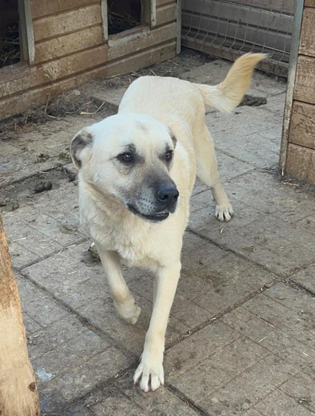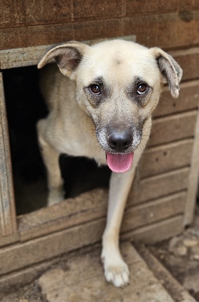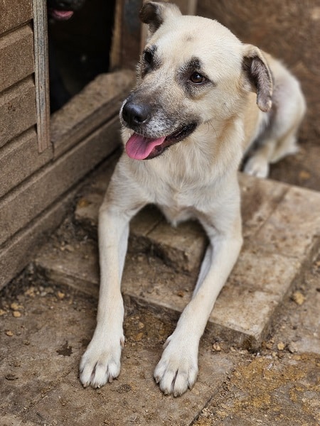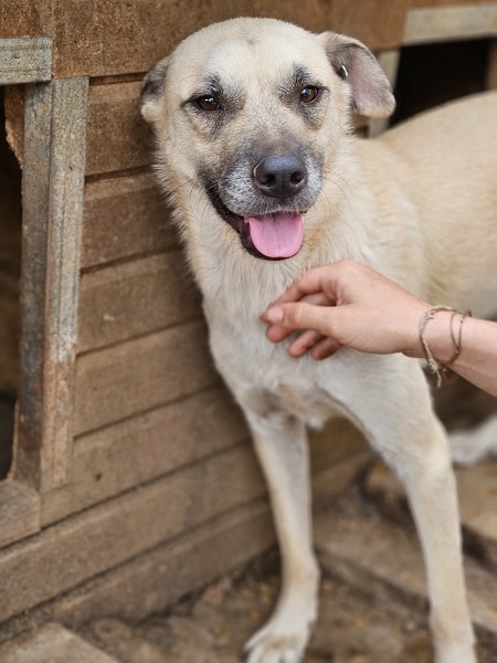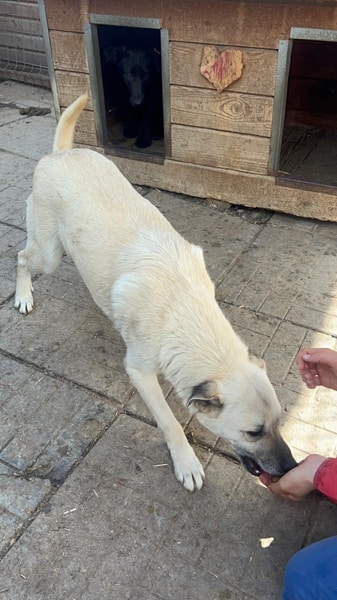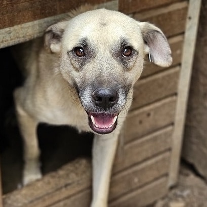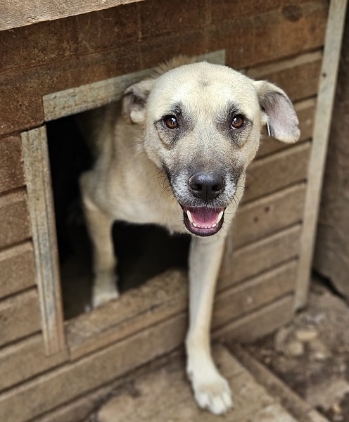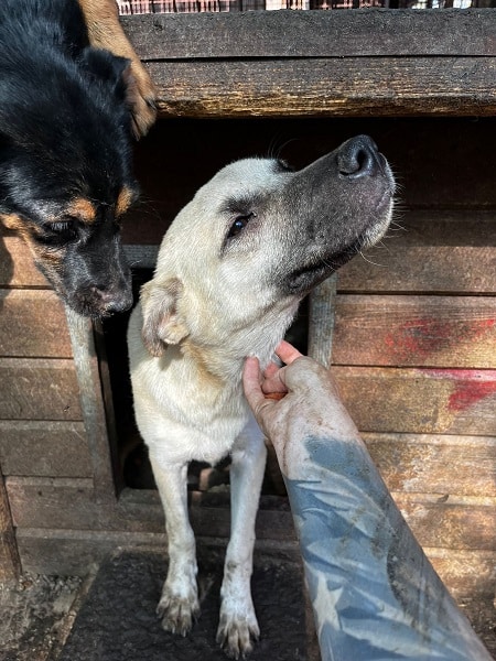 DARIUS beobachtete uns neugierig aus seiner Hütte als wir seinen Kennel betraten. Er brauchte einen Moment, bis er merkte, dass wir es gut mit ihm meinen. Danach nahm er gerne unsere Leckerchen und wir konnten ihn auch gut streicheln. Er ist dabei aber schon etwas unsicher. DARIUS sollte zeitnah ausreisen, damit er positiven Kontakt zum Menschen kennenlernt.