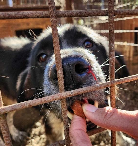 DEDI machte uns beim Besuch diesmal etwas Sorgen, er wirkte angeschlagen und war uns gegenüber auch etwas verhalten. Trotzdem zeigte DEDI sich freundlich, nahm die angebotenen Leckerlies dankbar an und war gut streichelbar. Der sonst so große Strahlemann sog plötzlich rasselnd die Luft ein und hatte blutigen Nasenausfluss. Wir meldeten den Gesundheitszustand der örtlichen Tierärztin, um die medizinische Versorgung sicherzustellen und hoffen, dass es DEDI bald wieder besser geht.