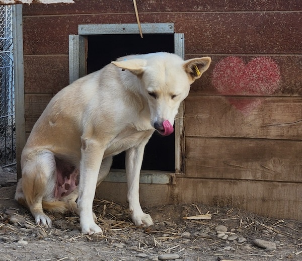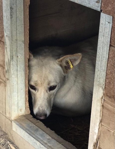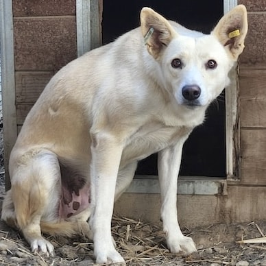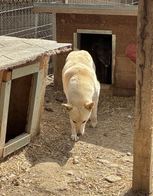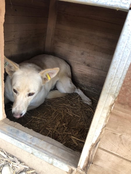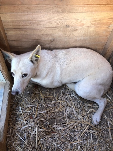 DEHLI lag anfangs in der Hütte und traute sich in unserer Anwesenheit nicht so recht herauszukommen. Erst als wir etwas Abstand nahmen, verließ sie ihre sichere Schutzzone. Die angebotenen Leckerchen nahm Dehli vom Boden bzw. dem Hüttendach und ließ sich anschließend ruhig vor der Hütte nieder. Zu mehr Kontakt war sie noch nicht bereit.