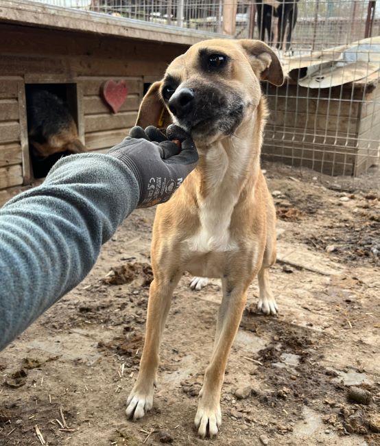 Die süße DELALI freute sich sehr über unseren Besuch und wartete schon auf uns am Kenneltor. Gerne nahm sie unsere Leckerchen und wir konnten sie dabei auch an der Schnauze berühren. In einer anderen Umgebung würde sie sicher schnell zutraulicher. Ihre offene, neugierige Art wird ihr dabei helfen. Wer hat ein Körbchen frei für diese süße Hündin?