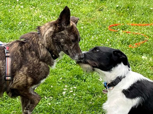Bei Hundebegegnungen ist sie noch unsicher und möchte lieber ausweichen, wird aber nicht panisch. Hier sind Zeit und positive Erfahrungen nötig. Das Thema muss in ihrem neuen Zuhause weiter bearbeitet werden. Mit einem sehr freundlichen Rüden hat sie nach 5 Minuten ausgelassen gespielt, obwohl er ihr zuerst Angst gemacht hat. Sie ist immer defensiv und niemals aggressiv.