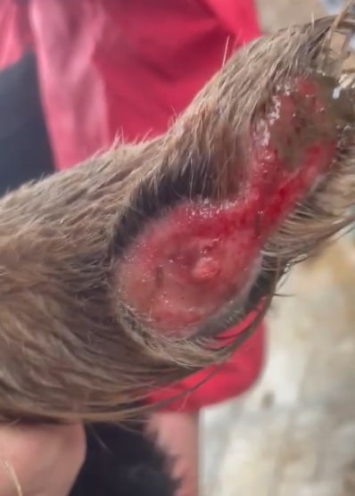 Leider ist ihre Pfote mittlerweile offen und entzündet. Sie benutzt sie weiterhin eingeschränkt, sie wird da aber unter diesen Umständen nicht wieder abheilen können. Sie braucht wirklich dringend einen Platz, raus aus dem Schlamm, wo dann auch die Pfote hoffentlich ordentlich abheilen kann.