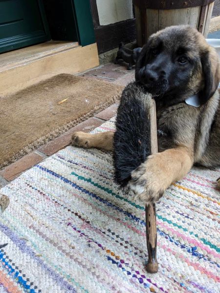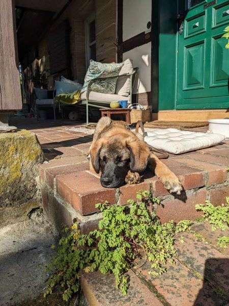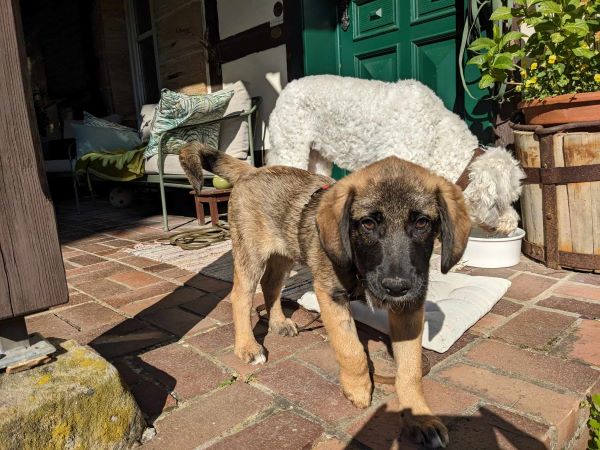 Seit Anfang/Mitte Mai 2024 in Deutschland auf einer Pflegestelle. Souverän und ausgeglichen. Das ist mein Eindruck nach gut eineinhalb Wochen. Welpentypisch erkundet er neugierig die Welt und blödelt auch gerne mit der Ersthündin rum. Dabei testet er natürlich aus, nimmt die Korrekturen der Hündin gut an und akzeptiert, dass er körperlich noch unterlegen ist. Kommt aber dann total gut runter, hat bisher nichts angeknabbert (da muss man natürlich schon gucken, das Wort „Nein“ ist ihm ein Begriff ) und bleibt super für einige Stunden alleine.