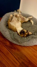 Er wird beschrieben als sehr liebenswerter Hund mit mittlerem Temperament, verträglich mit anderen Hunden und sehr neugierig gegenüber Menschen. Auch mit Katzen und Kindern klappt es sehr gut. Alleine sein wird noch geübt aber klappt bis auf ein paar Minuten leises Winseln schon ganz gut.