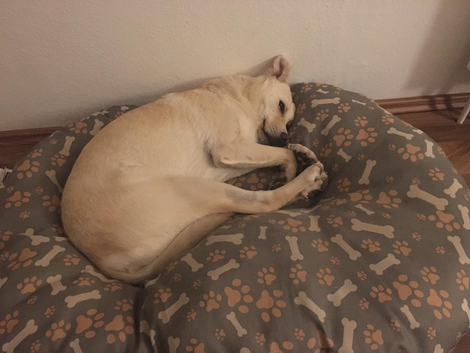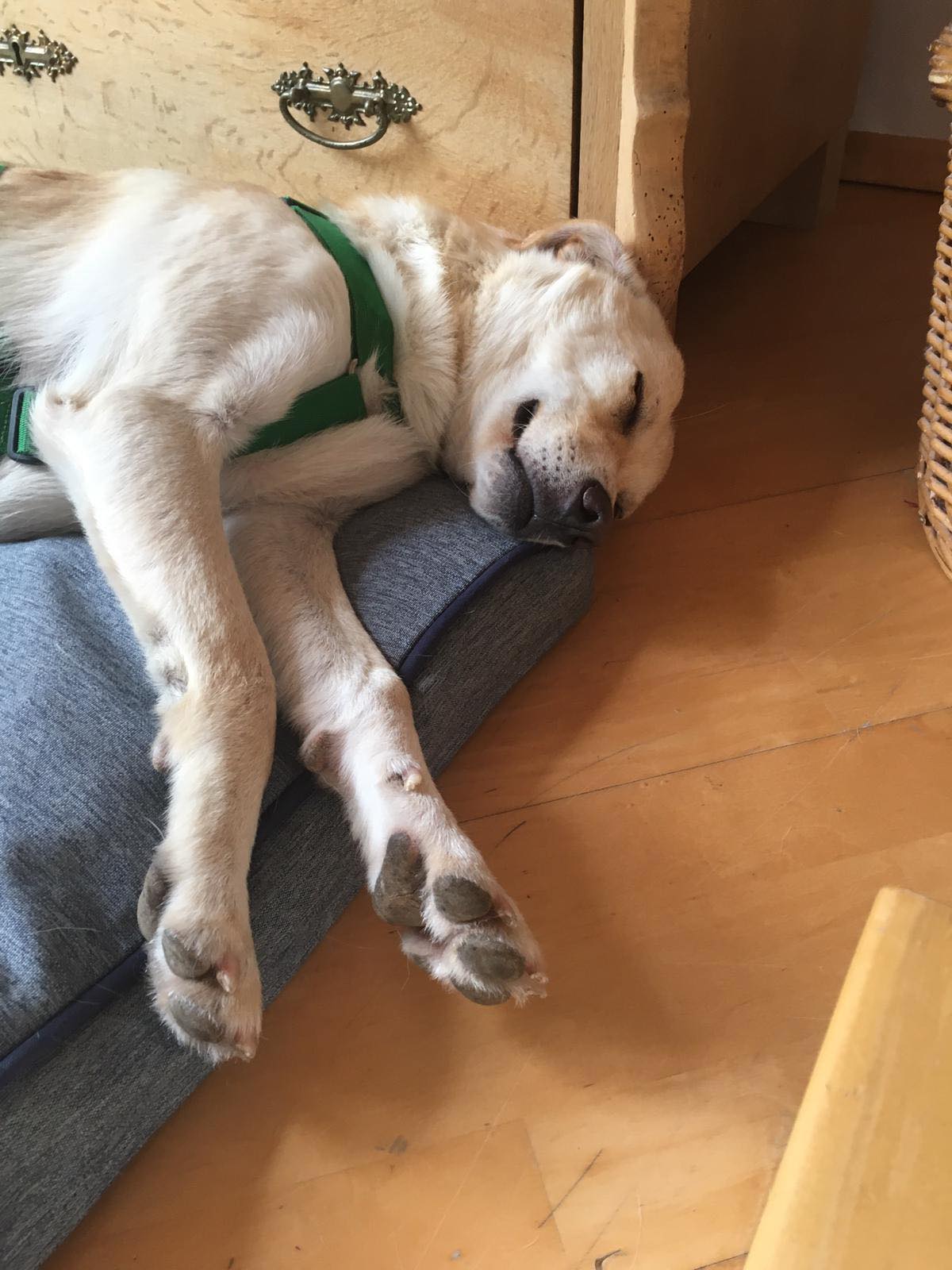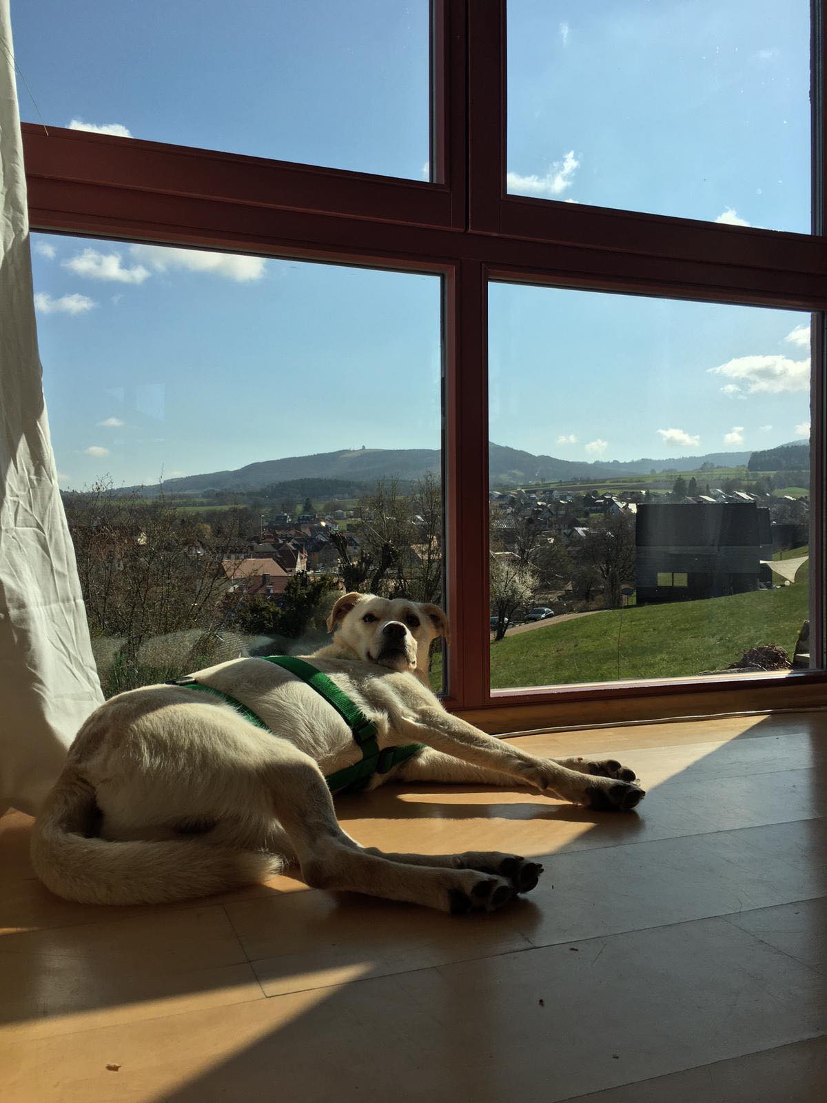 Drinnen ist er sehr entspannt, der ideale Partner fürs Home Office! Das alleine bleiben wird besser, muss aber noch weiter geübt werden.