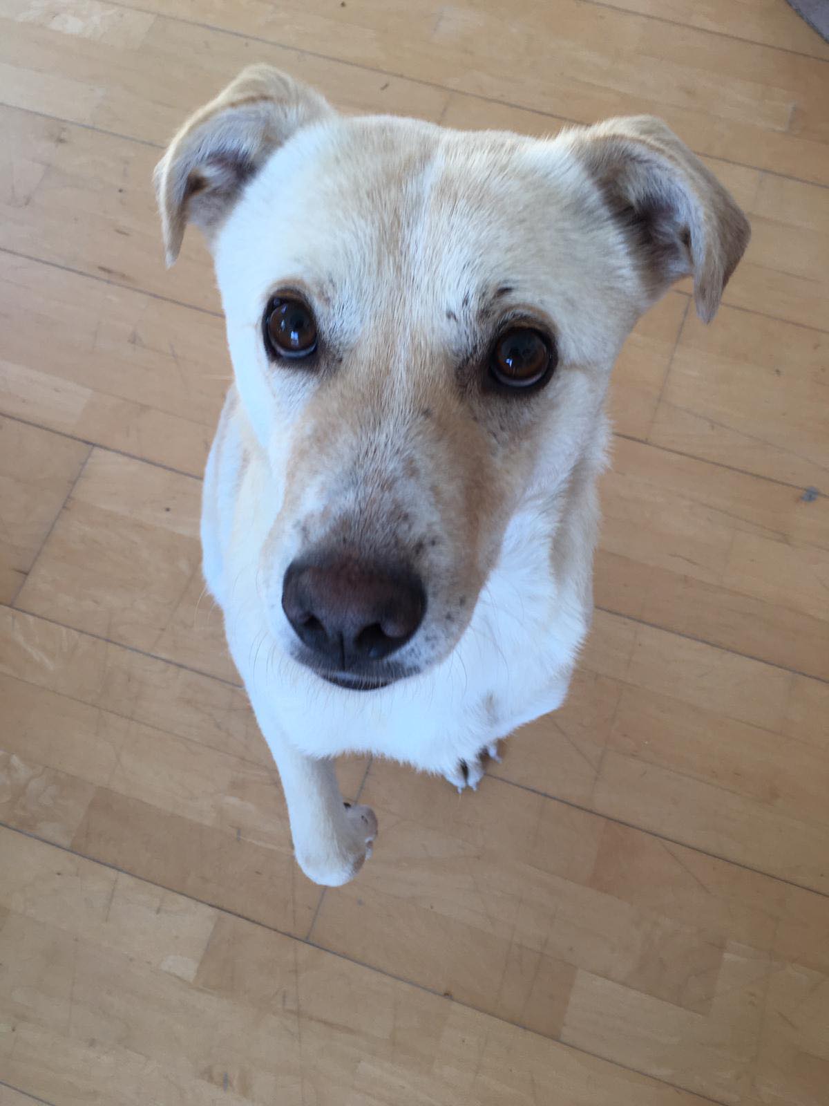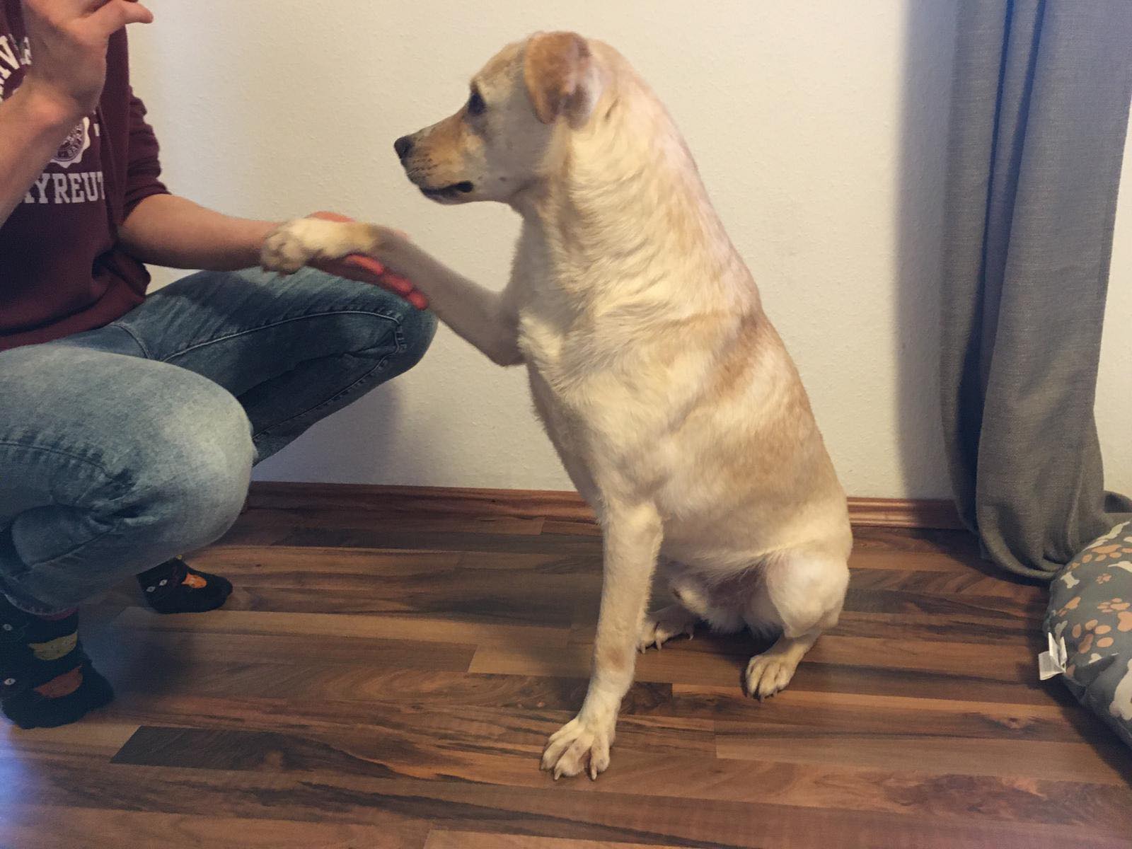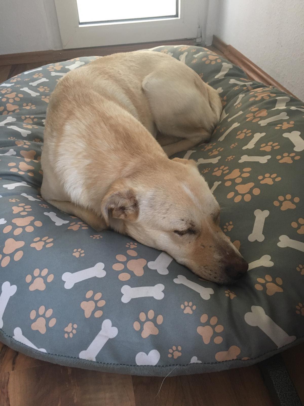 Drinnen ist er sehr entspannt, der ideale Partner fürs Home Office! Das alleine bleiben wird besser, muss aber noch weiter geübt werden.
