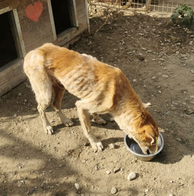 DJANGO ist zum Notfall geworden! Er hat leider weiterhin stark abgebaut, ist rappeldünn und ist vollkommen fertig. Als wir den Kennel betraten, lag er in der Hütte. Wir merkten schnell, dass er nicht ans Futter und ans Wasser gelassen wurde und in unserer Anwesenheit fraß und trank er erst einmal ausgiebig. Dabei wurde er von einem im Kennel lebenden Rüden stets kontrolliert.