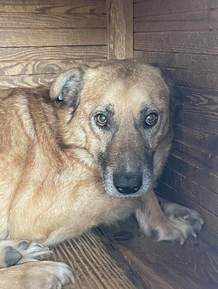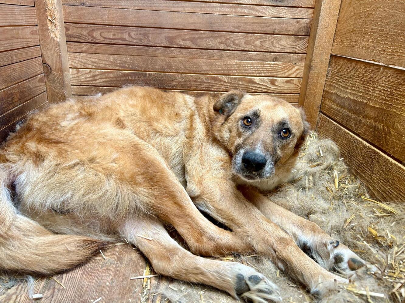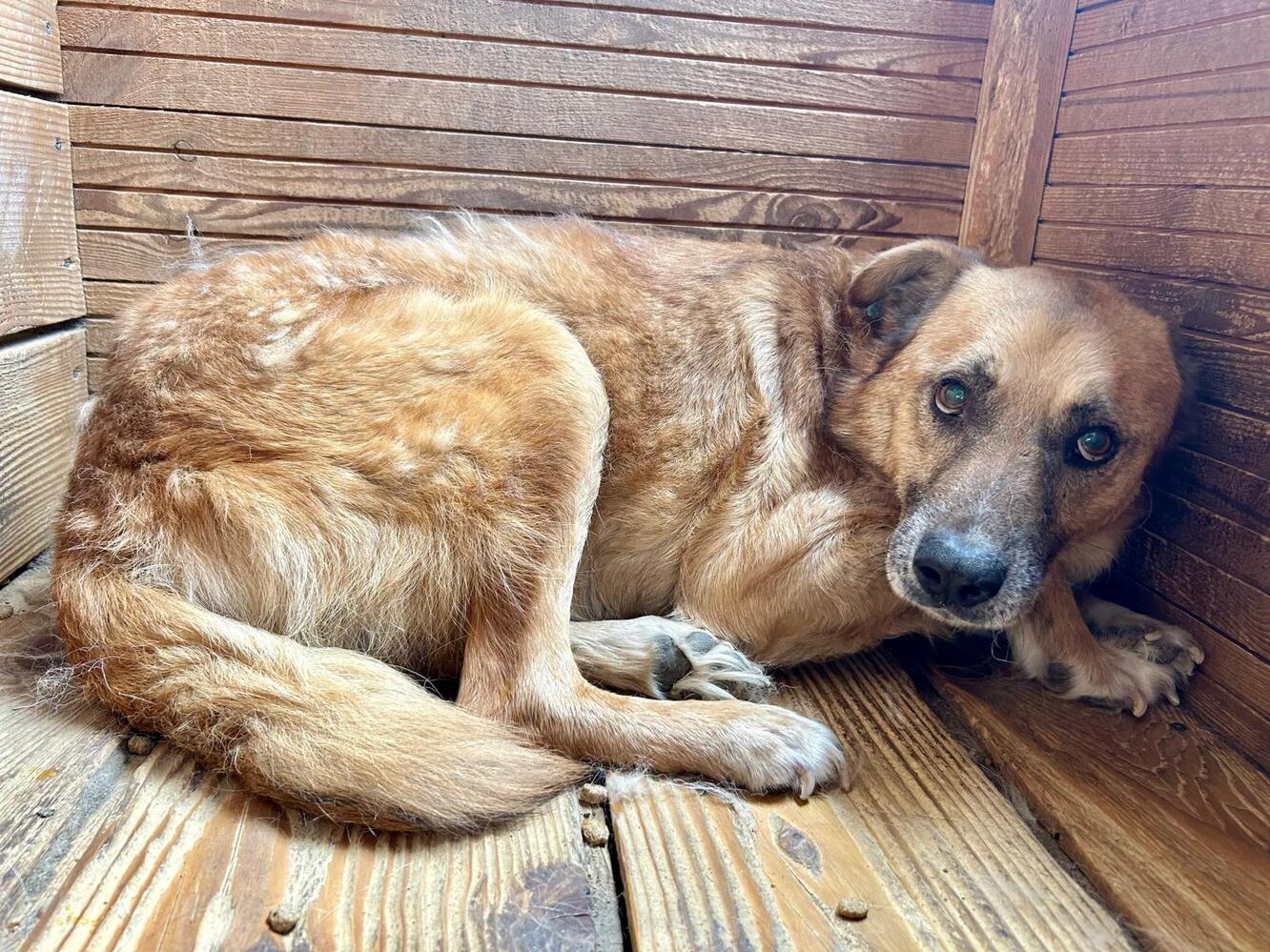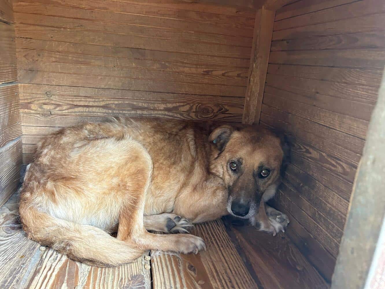 DOMANI ist bereits seit 2021 unentdeckt im Shelter. DOMANI lag während unserer Anwesenheit ausschließlich in der Hütte und wirkte teilnahmslos, so als habe er resigniert. Er scheint vom Leben nichts mehr zu erwarten. Auch als wir uns ihm zuwandten, rührte er sich nicht, angebotene Leckerli konnten ihn nicht locken. Beim Versuch ihn in der Hütte zu streicheln, reagierte DOMANI zunächst mit einem kurzen Abschnappen und ließ es dann aber zitternd über sich ergehen.