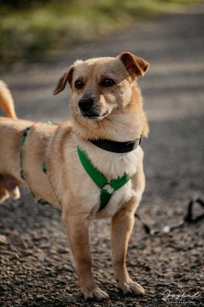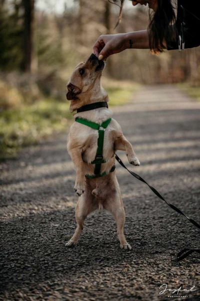 Er geht gerne spazieren und läuft ohne Ablenkungen auch schon super an der kurzen und langen Leine. Er reagiert jedoch noch gestresst auf andere Hunde und teilweise auch noch auf schnelle Bewegungen wie Fahrräder, was sich in Bellen und/oder Fiepen äußert. Er ist dabei immer gut händelbar und lässt sich auch leicht ablenken, da er allgemein sehr auf seine Menschen achtet. Lernt er die anderen Hunde dann kennen, kommt er gut mit ihnen zurecht. Es braucht aber weiterhin Training und Geduld, damit er unterwegs entspannter wird. Wer Dominique ein Zuhause gibt, erhält einen treuen Freund, der wahnsinnig viel Liebe zu geben hat und sich mit etwas Geduld auch bei Spaziergängen zum idealen Begleiter entwickeln wird (Zuhause ist er das nämlich schon).