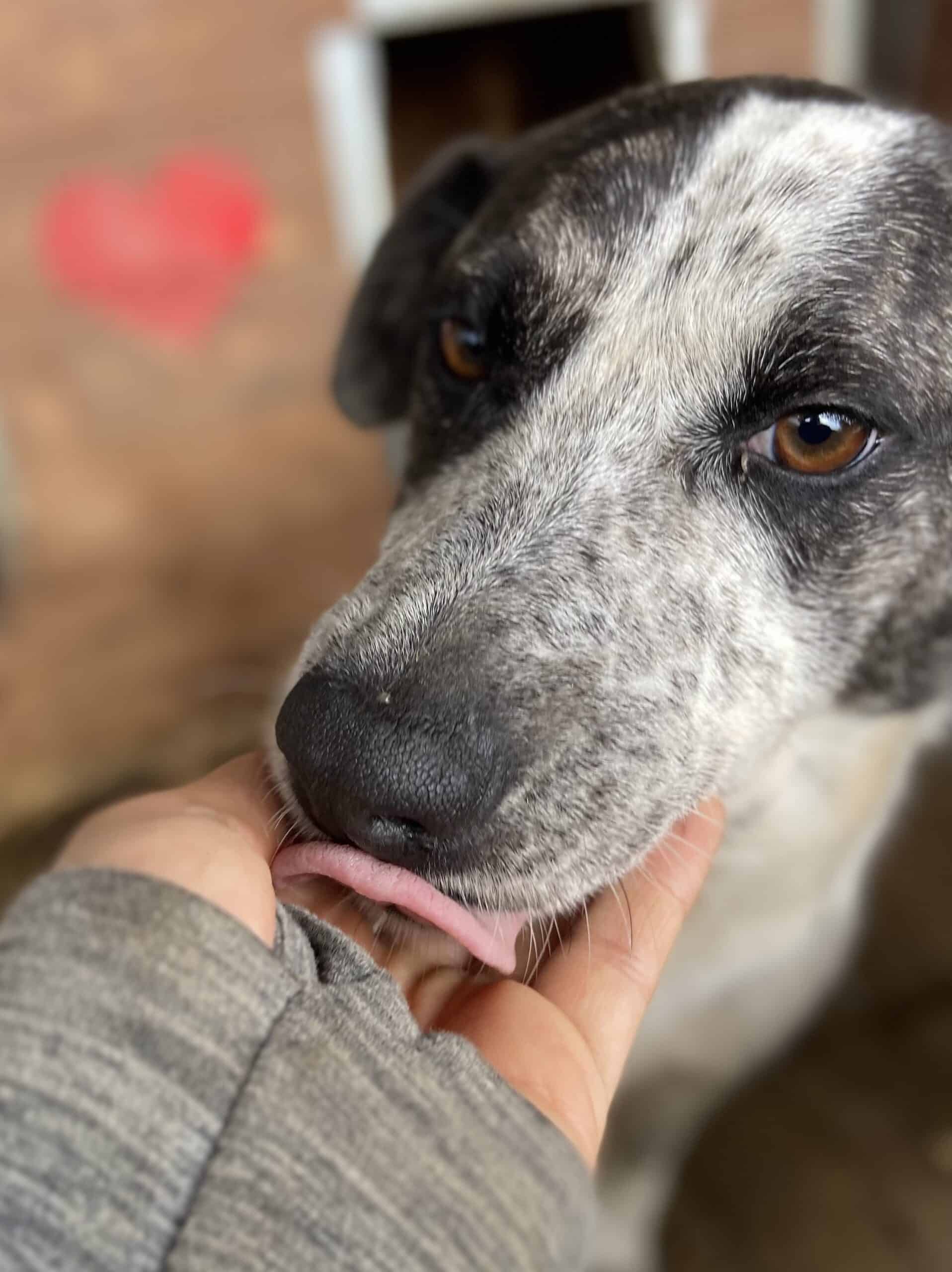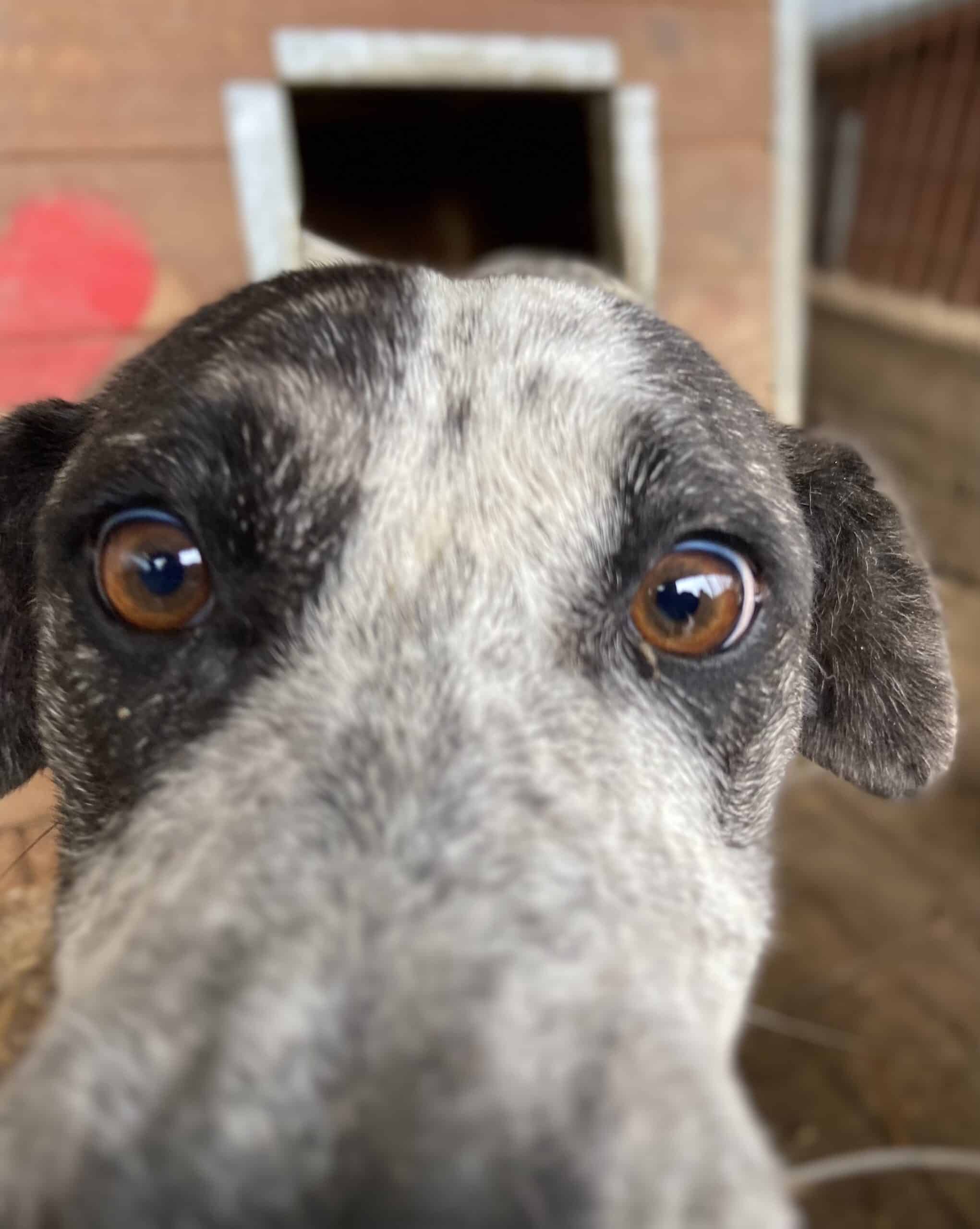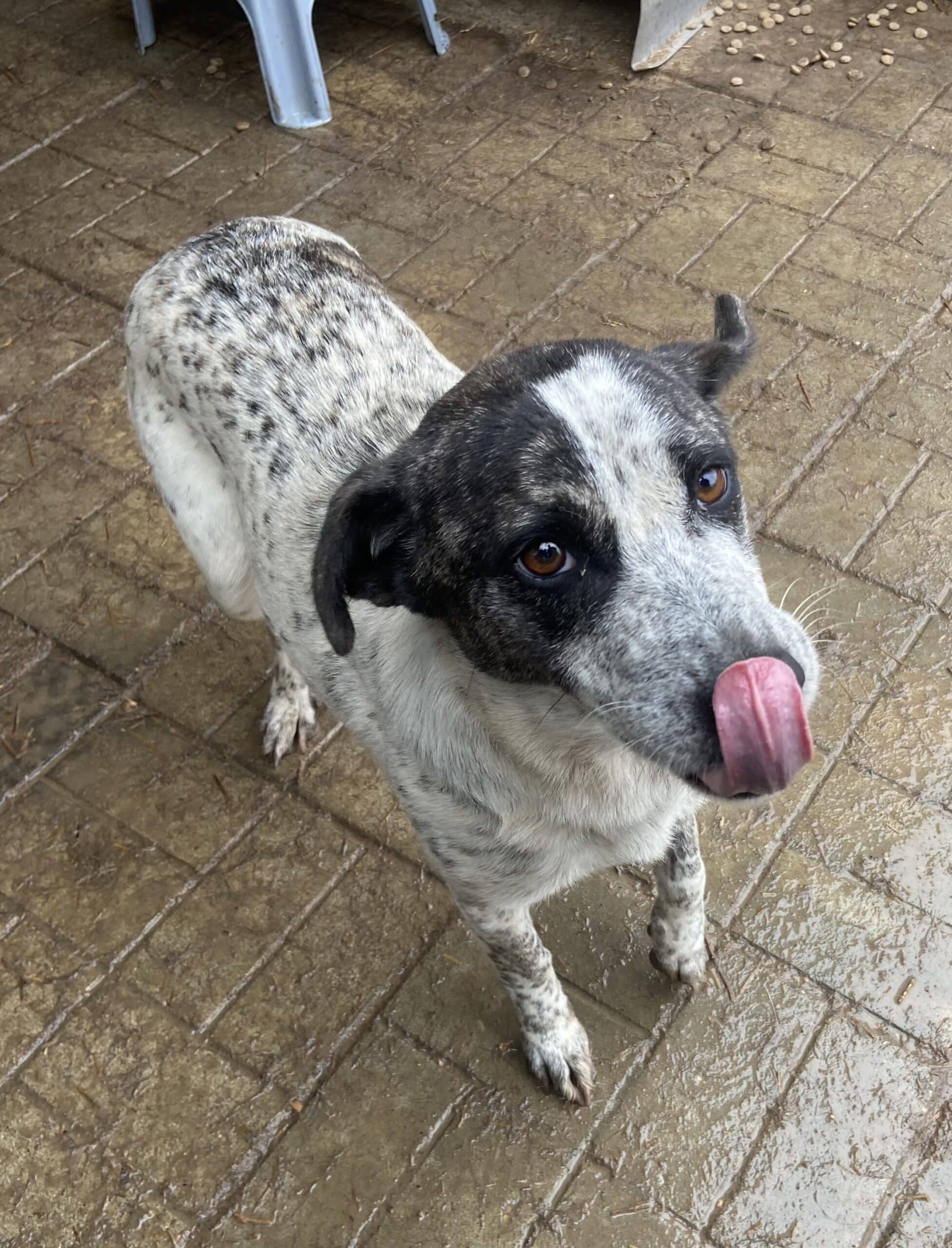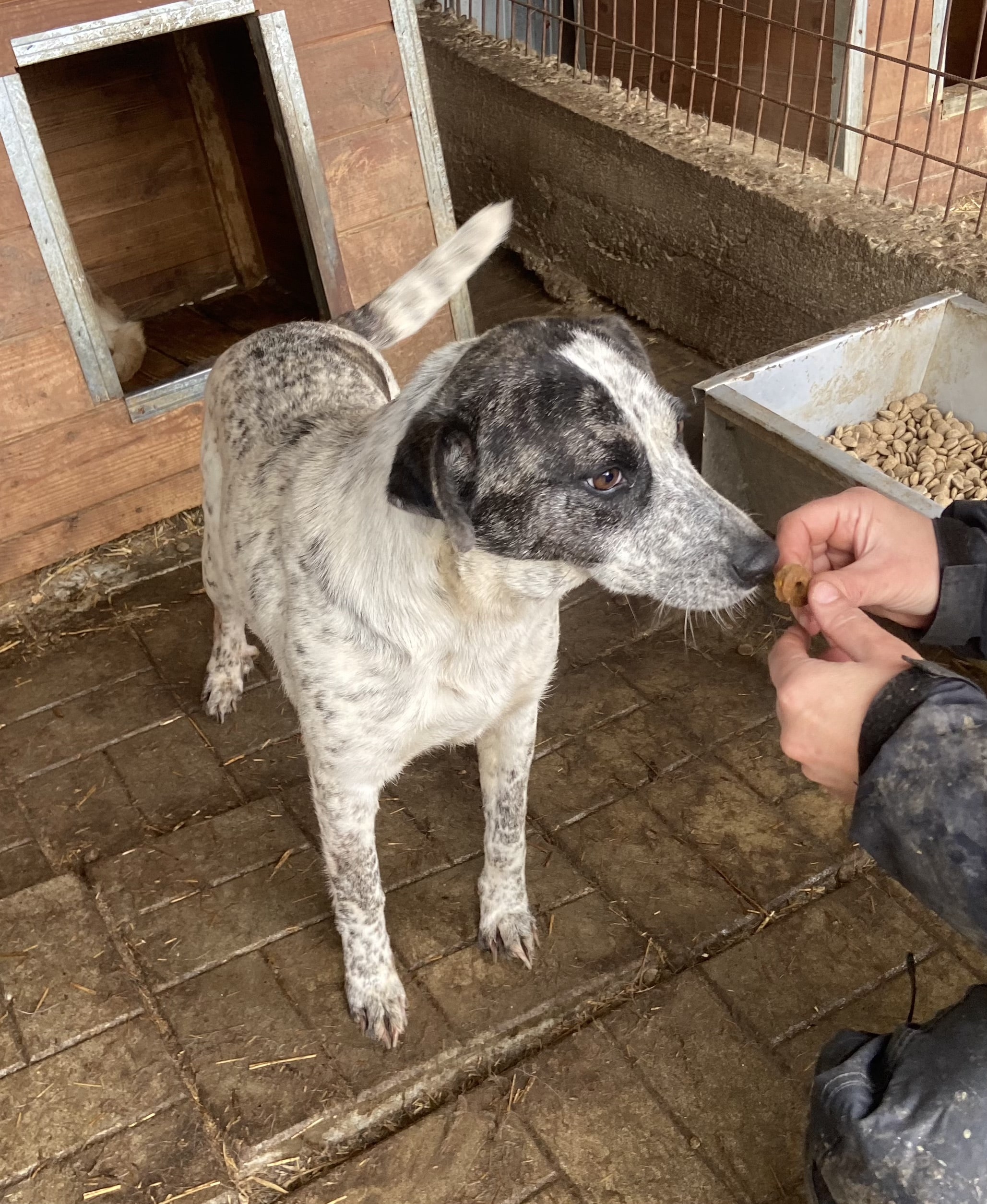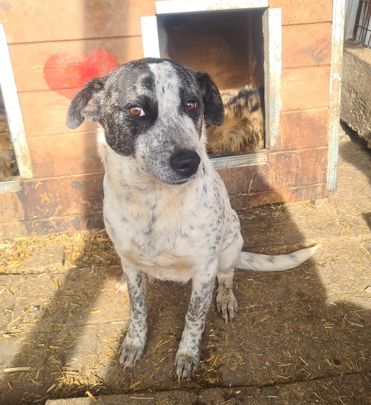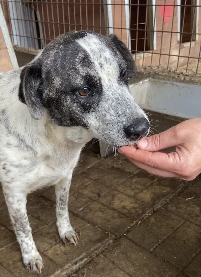 Als wir den Kennel betraten, lag die süße DOTTY noch in der Hütte und beobachtete alles. Erst als die Aufregung etwas vorbei war und wir uns ihr zuwandten, kam sie raus und zeigte sich sehr offen, zutraulich und interessiert. DOTTY ist eine ganz besondere Hündin, denn sie „grinst“, wenn sie sich freut (siehe Fotos). Dies kann als Droh-Signal missverstanden werden, doch bei ihr ist es einfach pure Freude. Die zarte DOTTY nahm gern unsere Leckerlie und ließ sich überall problemlos streicheln. Sie ist eine ganz liebe und ruhige Maus. Aktuell lebt DOTTY in einem Rudel aus Hündinnen, was gut funktioniert. Wir verstehen nicht, warum so ein toller Hund noch nicht entdeckt wurde, wir wünschen uns so sehr, dass unsere sanfte DOTTY endlich ihre Menschen findet und ein richtiges Leben kennenlernen darf, ohne all den Shelterstress.