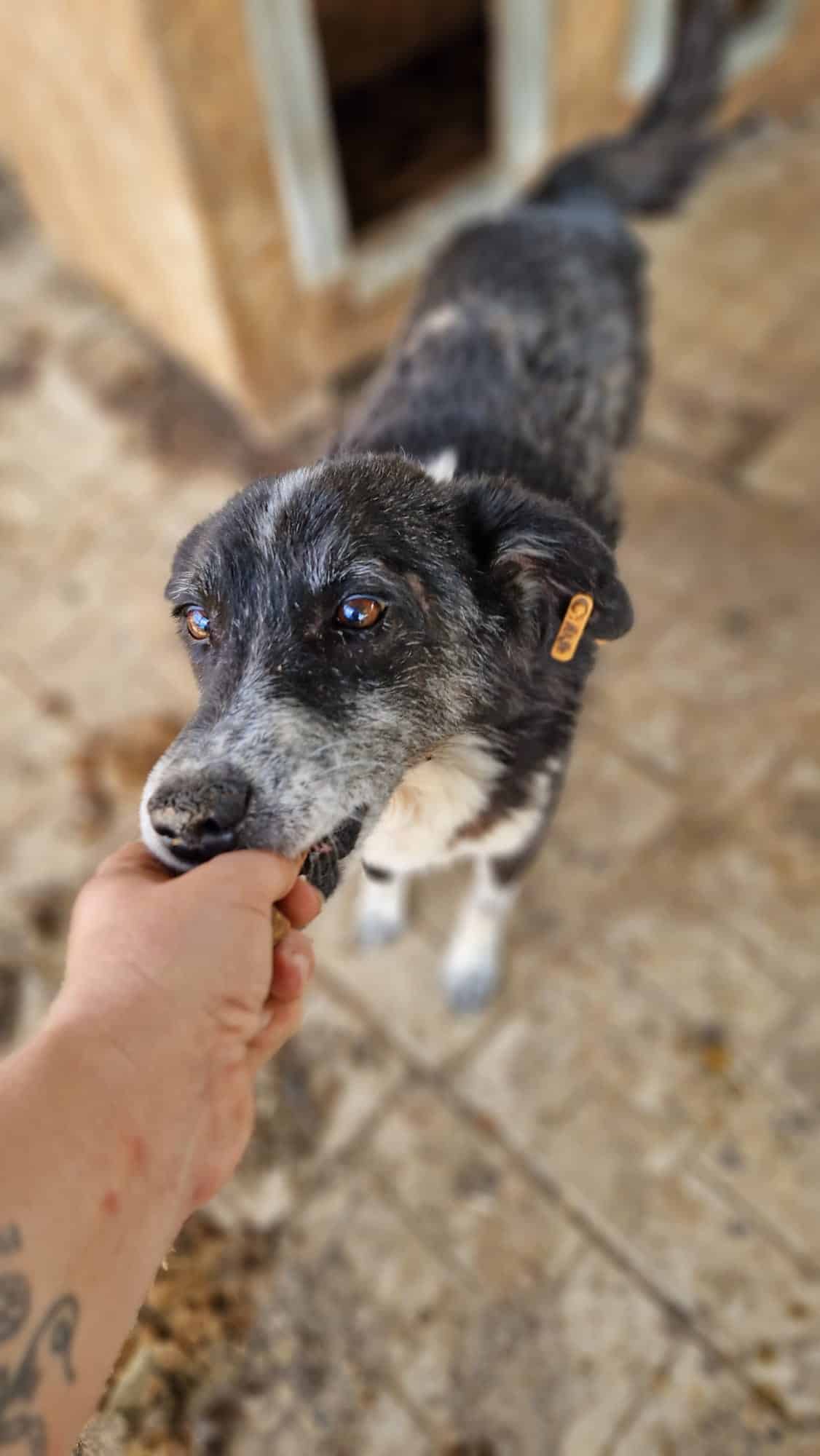 DRAGO nahm Leckerlie aus der Hand, in seiner Hütte lässt er sich auch streicheln.