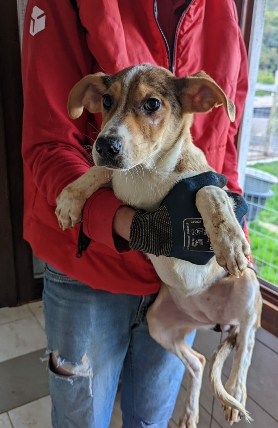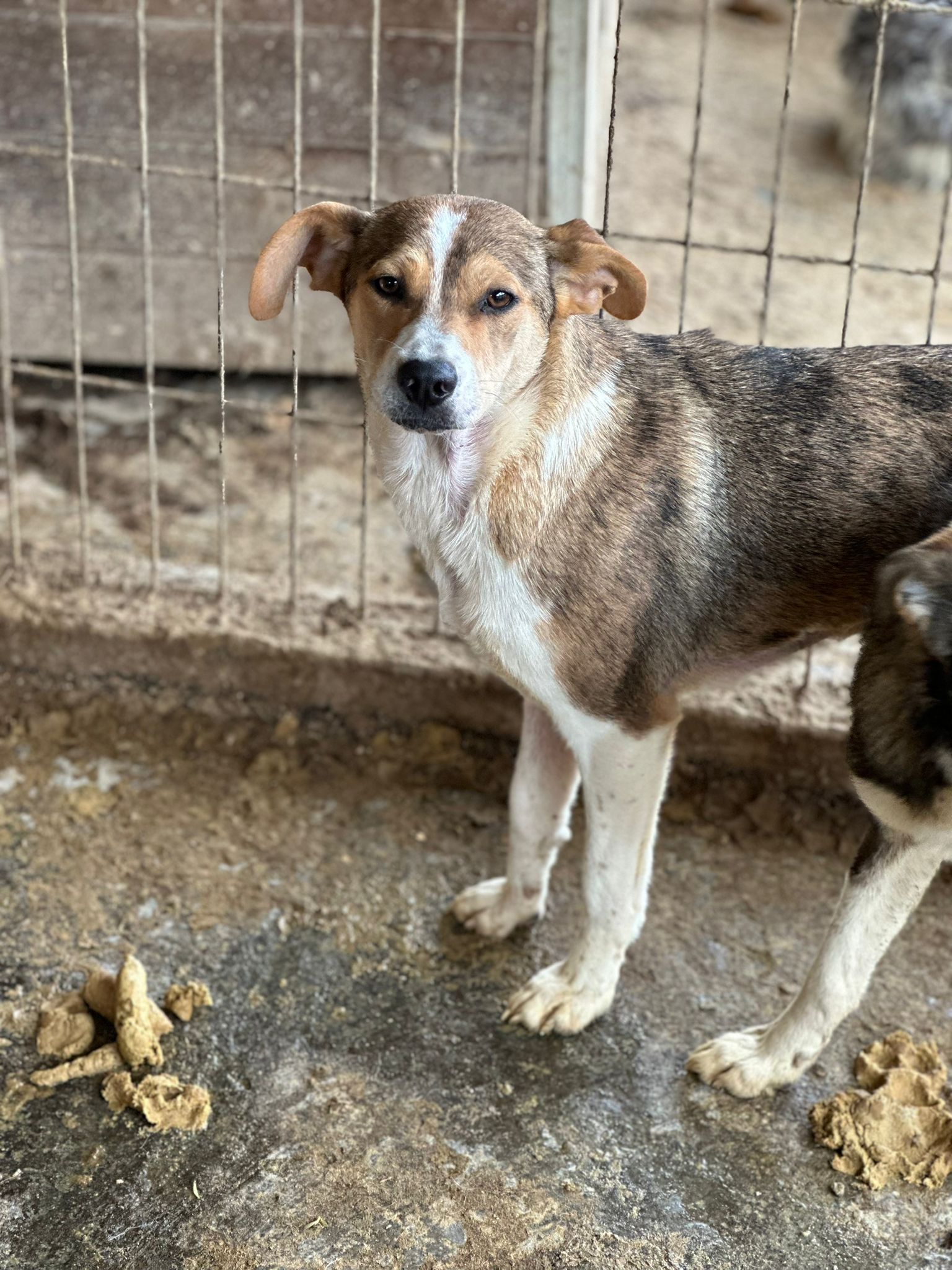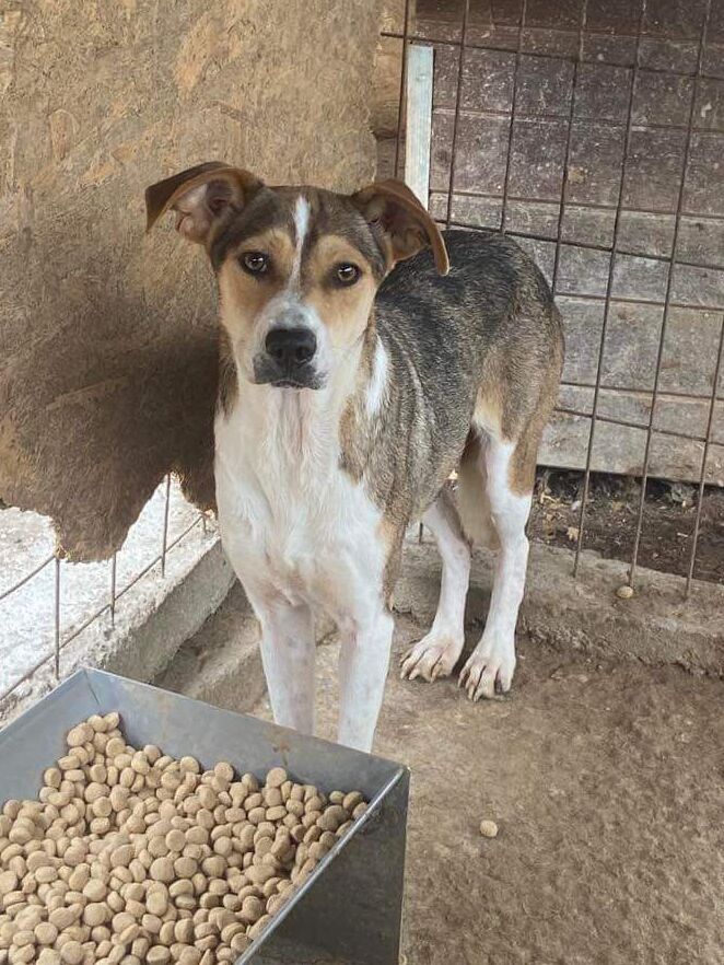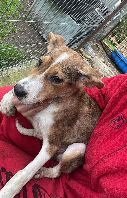DUCHESS zeigte sich anfangs unsicher, gleichzeitig neugierig und interessiert. Sie taute schnell auf und kam nah zu uns ran um sich Leckerchen aus den Fingern abzuholen. Leider ist aber auf Grund eines dominanten Rüden im Kennel schnell wieder verunsichert.