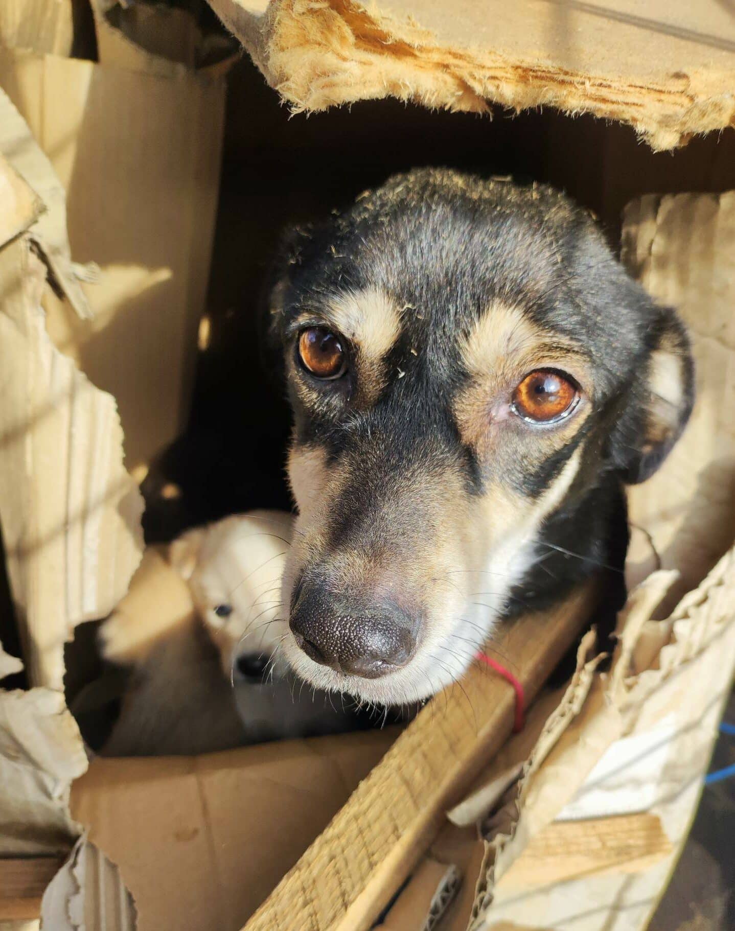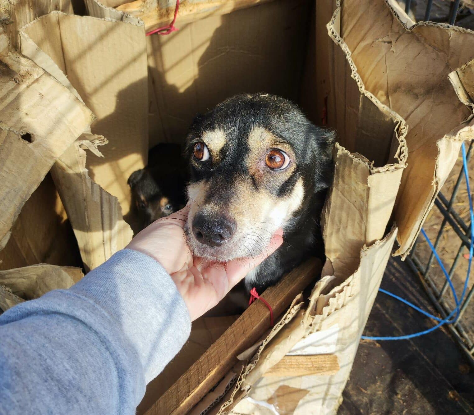 Die freundliche kleine EDDA wurde mit ihren 5 Welpen in einem verschnürten Pappkarton nach Bucov gebracht. Die Schnüre waren kaum aufzubekommen und sie müssen schon einige Zeit dort drin gesessen haben…